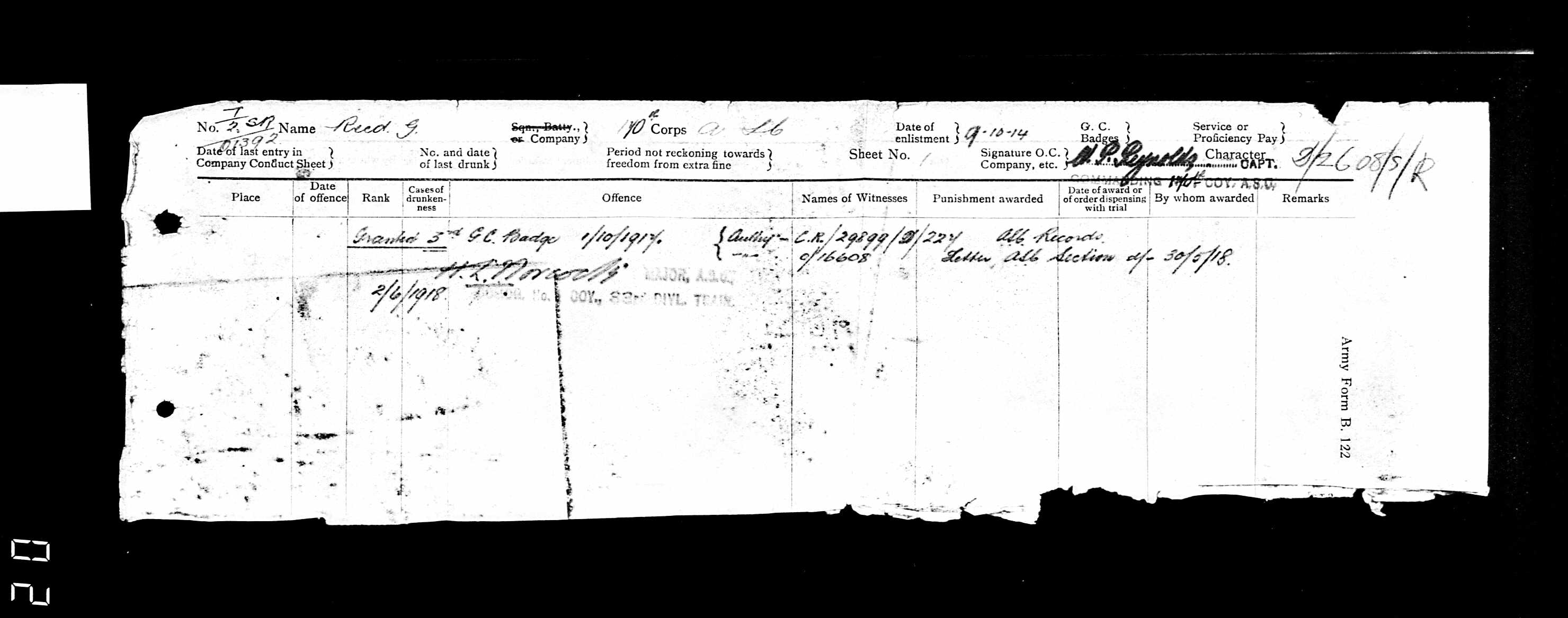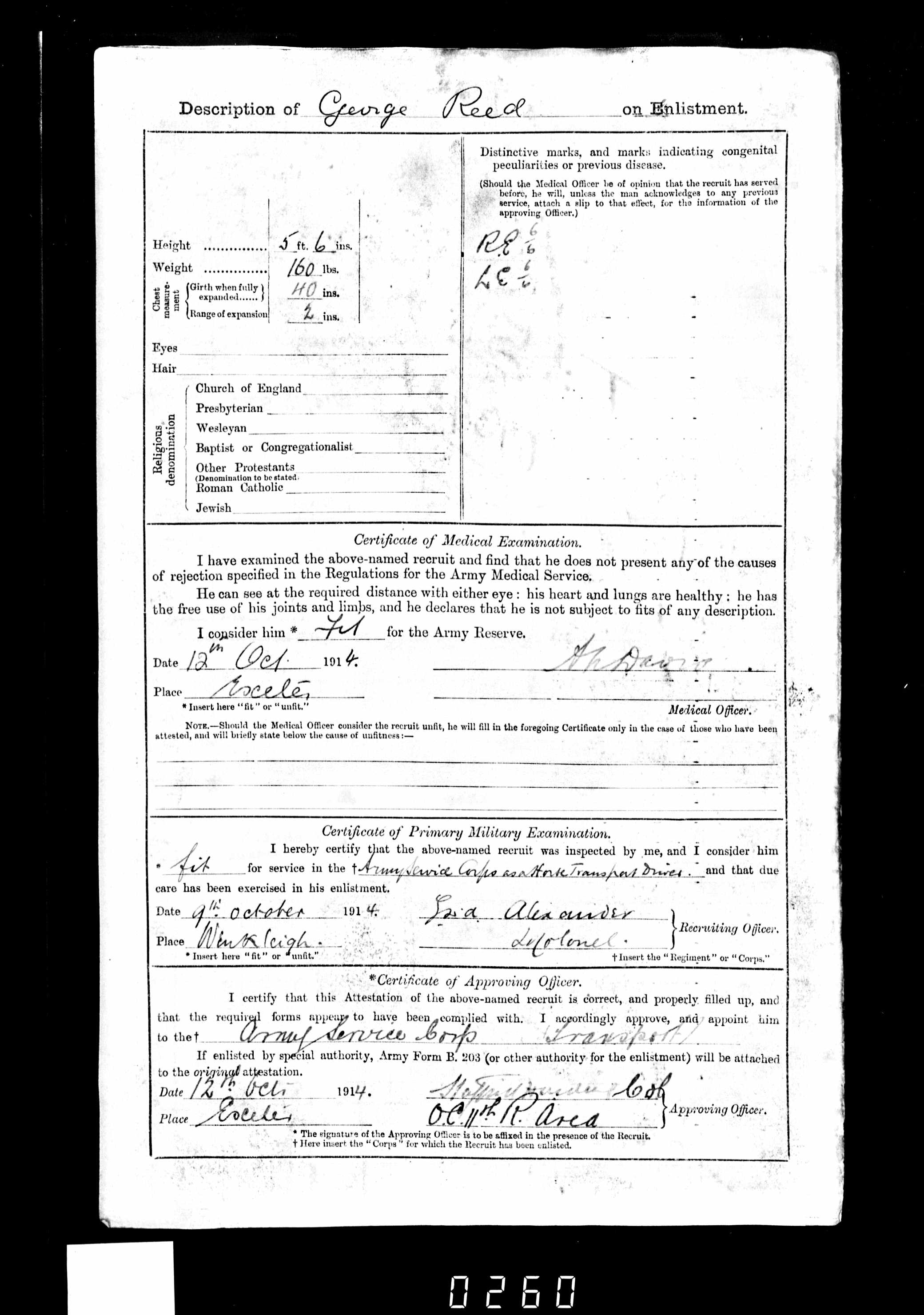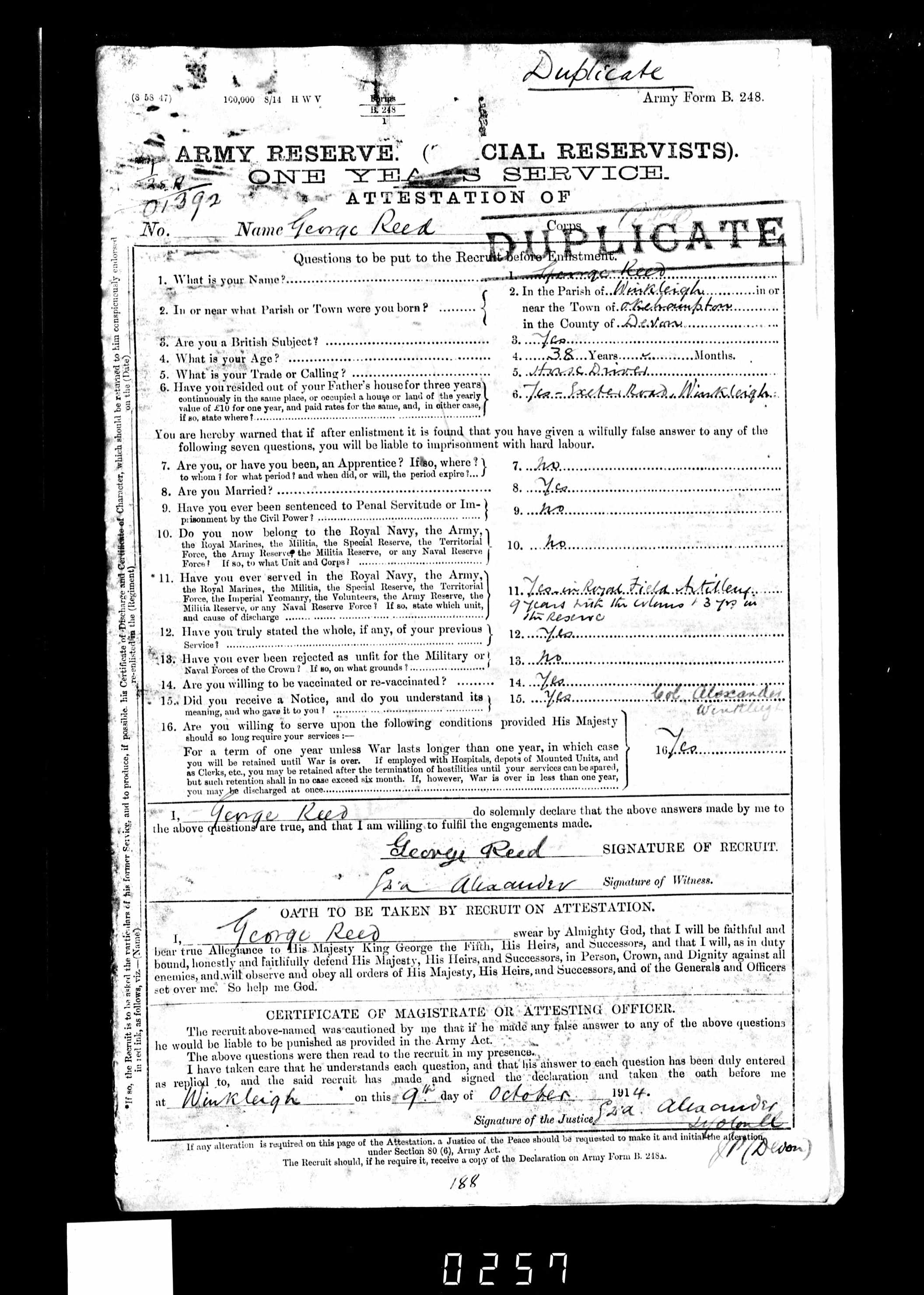 George Reed was a distinguished soldier, a veteran of the Boer War, and whose name is proudly recorded in the Chumleigh Deanery Magazine as having re-enlisted as a reservist in the first months of 1914. Obviously a very fit man, he was (according to the 1911 census) already 40 years old when war began, but in order to serve, George stated that he was only 38. We are extremely fortunate that not only his medal card but an almost entire set of documents relating to his full army career and war service have survived the bombing which destroyed so many priceless archives, and from these the full picture emerges.