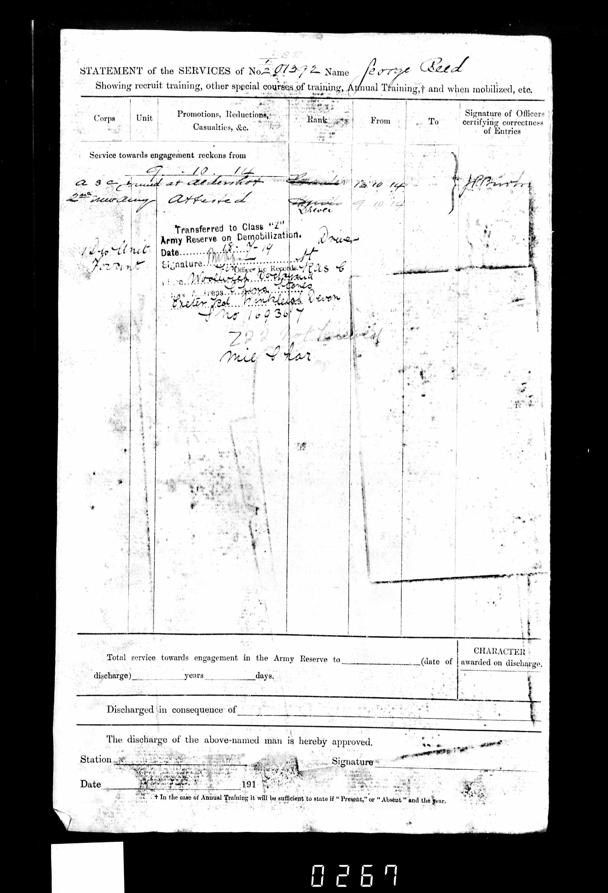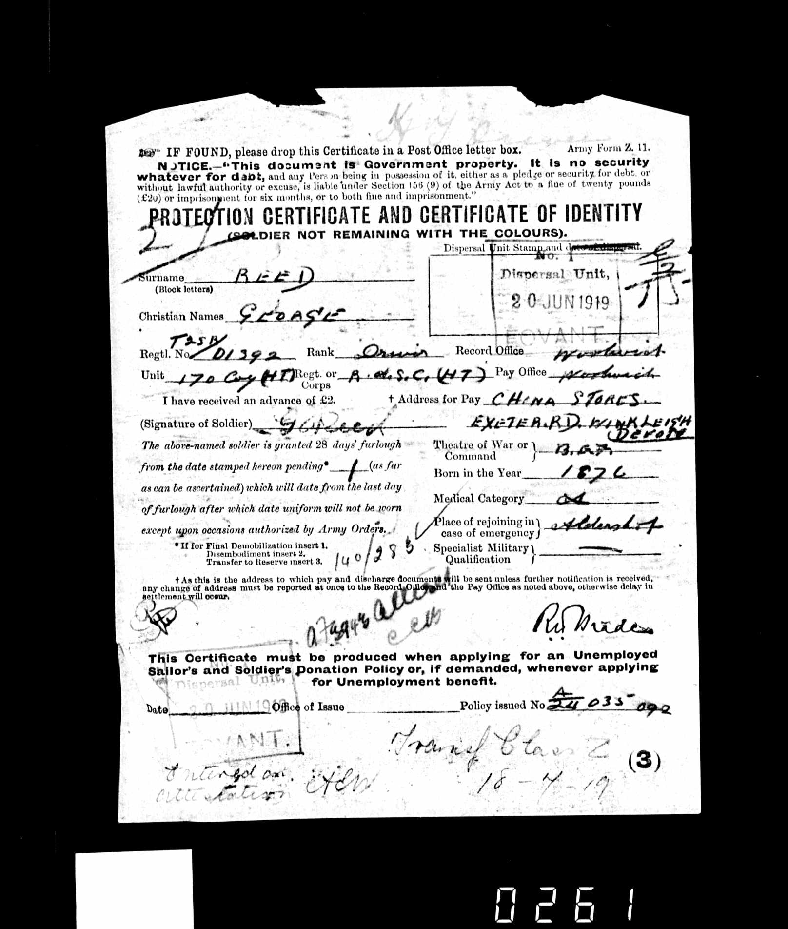 As with all demobilised soldiers, George received his Protection Certificate on 20th June at the No.1 Dispersal Unit at Fovant, and was re-classed as a ‘Z’ Reservist. He is recorded at the end serving in 170 Coy.ASC, now having re-trained to work with the Heavy Motor-Transport, a mark of how the now re-named Royal Army Service Corps had moved on a long way from almost total reliance on horses.