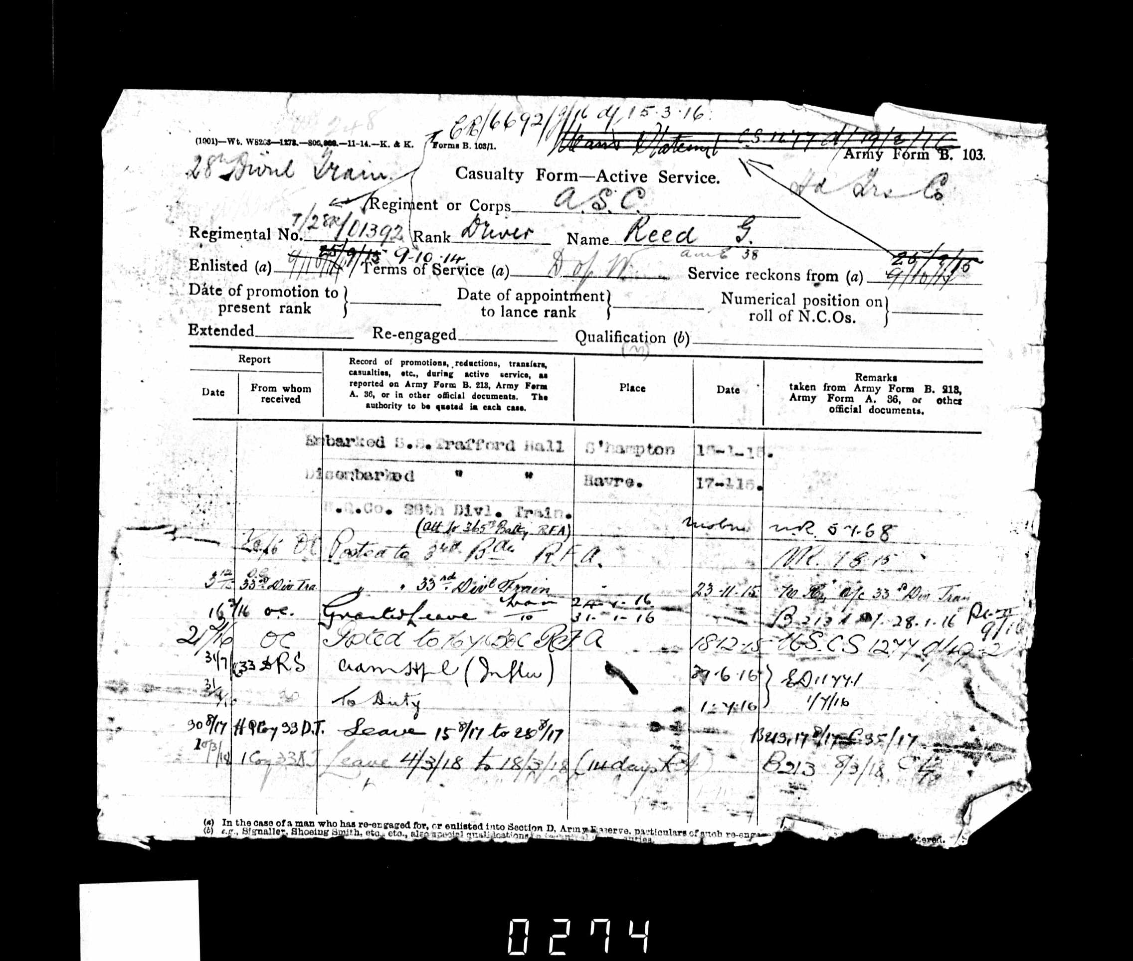 George Reed was enlisted by Col. Alexander, a local JP, acting as the recruiting officer for Winkleigh, on 9th October 1914. Here it is recorded that George had already served 9 years with the colours and 3 years in the reserve, in the Royal Field Artillery. He had been a horse driver, one of a team of three drivers per field gun controlling 6 horses, and now George, describing himself again as a horse driver, made sure that this time he could choose the same occupation in the somewhat safer option of the Army Service Corps. The medical inspection was held at Exeter on 12th October, and George is described as a fit man, ready for service as a transport driver in the ASC. The military sheet reveals that his service in the Boer War was indeed distinguished, with action at the battles of Talana, the defence of Ladysmith and Langs Nek, earning George both the Queen’s Medal and the King’s Medal, with clasps for all three, and having served in the Orange Free State and the Transvaal. He had been wounded slightly at Ladysmith, but with no ill effects. On re-joining the army he first served at home between 9th October 1914 and 14th January 1915, attached to the 28th Division, before moving to France on 17th January (confirmed by his medal card).