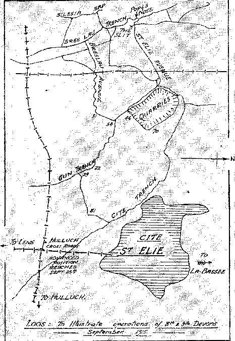 The battle of Loos lay ahead. The 7th Division moved South In September, the 8th and 9th Battalions taking position on a front due East of Vermelles with its right resting on the Vermelles – Hulluch road and the famous Quarries directly in front. Vast preparations were in progress for the ‘Great Push’, of which the Germans were of course very well aware: at the behest of the French the battle was to take place in an area totally unsuitable for a frontal attack over flat and open ground, with inadequate shelling that could not cut the German wire. In so-called ‘reserve’ just before the battle began on September 25th, the 8th and 9th Devons spent the time digging new forward trenches, saps, communication trenches and just before the battle bringing up into the forward line the heavy gas cylinders that were to be discharged in the hope that the 1st line German trenches would be overrun without great casualties. Unfortunately, when the advance began at 6.30 am, (see map on the right) the wind blew the gas not into the Germans, but along the line of our own front incapacitating many whose only protection were the so-called smoke helmets whose talc windows quickly became blurred and useless. In the 8th, by an oversight, ‘A’, ‘D’ and ‘C’ Companies moved forward together, crowding the gaps in the British wire and presenting great targets to the Germans, but their objective, Breslau Trench, was taken 12 minutes into the assault followed by the Breslau reserve trench. Casualties were horrendous, and by now only three officers remained standing. The Germans were abandoning their positions and both the Cite St. Elie and Hulluch were there for the taking, but no reinforcements arrived and without them the Devons could do no more. The 9th Devons had pushed on towards Gun Trench where on the arrival of the 8th the Devons succeeded in capturing a battery of field-guns, but they too could go no further than the Hulluch crossroads, and later in the day were forced back to the chaos of Gun Trench. A German counter attack on Gun Trench almost succeeded but was repulsed after fierce hand-to-hand fighting, but the 8th Battalion now amounted to little more than remnants, mixed up with the 9th and the remains of a battalion of Scottish troops from a brigade of the Second Division. The position was precarious: at the end of the line the Quarries had been retaken by the Germans. Overnight about 50 men of the 8th took a position on the south side of the Vermelles-Hulluch road where they remained on the 26th, while a similar group were in position north of the road. To their left the line was held by the 9th battalion. In the evening the 9th were withdrawn to their old start line trenches and those that were left, numbering just under 150, must have felt all had been in vain. Here they remained in support until 29th, when they moved back to billets in Beuvry.
