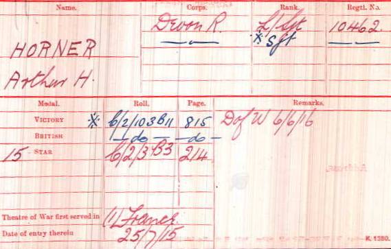 Arthur Horner can be remembered in Winkleigh as one of the first to join the colours, served well in his battalion and though his death was accidental was perhaps for that the more tragic. Within a few days the Battalion he had served so well was again decimated on the first day of the Battle of the Somme, when the 20th Brigade attacked Mametz. On that day alone 3 officers and 47 men of the 8th were killed or missing, with 7 officers and 151 men wounded.