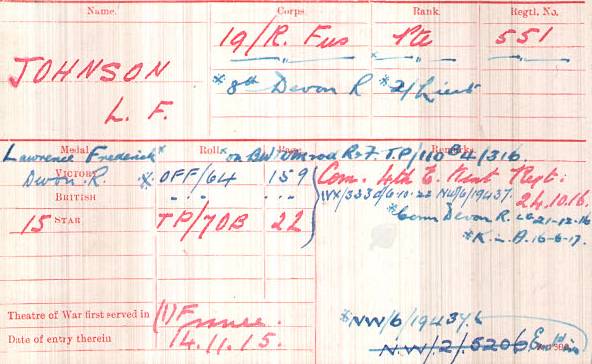 Lawrence became age 18 in mid 1914, when war broke out and he was able to enlist almost at once. His brother Ronald Henry K. was commissioned into the Devonshire Regiment, and his sister Evelyn joined the Voluntary Aid Detachment, and both are listed on the Winkleigh Roll of Honour. The Chumleigh Deanery Magazine for November 1914 records that among many other volunteers from Winkleigh, Lawrence Johnson originally enlisted in the Public Schools Brigade of Kitchener’s New Army. Two regiments in the British army responded to the enthusiasm to join up the moment war was declared, by the men and boys from the Public Schools - The Royal Fusiliers and the Middlesex Regiment. So great was the enthusiasm shown by those who had had some military training in their school’s cadet forces, that many avoided the delay that would be caused if they had applied at once for commissions. Most people in the U.K. believed the war would be a short one and these Public Schools men were determined not to miss ‘the big picnic’. There was also another class of young men who were allowed to join these elite battalions of Kitchener’s new army: those who had not been to the top Public Schools but to other prestigious establishments regarded as slightly ‘higher’ than the Grammar Schools. Lawrence Johnson could be included in this category: unlike his elder brother who had attended Cheltenham School, Lawrence had been educated at an agricultural college, because his father intended that he should eventually manage the family estates and tenanted farms in and around Winkleigh.