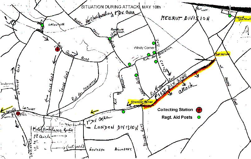 May 9th ‘The lightly wounded men had to find their own way back to the collecting stations, at Windy Corner and Le Touret which took in the majority of the casualties. The more serious cases were carried by hand from the Regimental Aid Posts to collecting stations that could be reached by motor and horse ambulances. From the collecting stations the wounded were taken by motor-ambulances of the 1st Division, helped by those of the 2nd Division and the London Division. The collecting stations were cleared by motor ambulances to the Field Ambulances established at Bethune. The Field Ambulances of the 1st Division were first filled, the wounded then being diverted to those of 2nd and the London Division. The motor ambulances adhered strictly to the traffic routes previously fixed which are shown in the sketch map. The Field Ambulances were cleared by motor ambulances to No.1 Casualty Clearing Station at Choques and No.4 CCS at Lillers. Wounds of the chest and those of the head not requiring immediate operation were taken to the hospital barges moored in the canal at Bethune.’ These barges brought the men down river to a hospital at St. Omer.