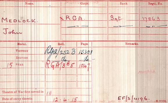 John and Isabel Medlock then returned to Malta where Britomarte Corcena, their third child, was born in 1911. The 1911 census shows that John Medlock was now a corporal (bombadier) in 99 Company, Royal Garrison Artillery stationed at Fort Ricasoli, Malta. In 1914, the family was again back in Ireland. The next we know is that the Chumleigh Deanery Magazine for July offered its deepest sympathy to Mrs. Medlock following the death of Sgt. Medlock on 5th June 1915. We read the useful information: ‘Sergeant Medlock, of the Royal Garrison Artillery, was stationed in Ireland when the war broke out. Only a few months ago he was sent to the front with the Trench Mortar Section’.