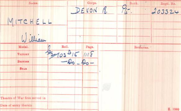 William was not one of the first from Winkleigh to volunteer, since the Chumleigh Deanery Magazine does not list him in the first two months, and his medal record shows that he was not in France in 1915. Instead he might well have waited to register under the Derby scheme, but in any case the Rev. Edmonds’ report seems to indicate that William volunteered rather than was conscripted. The Derby Scheme, first announced to the country on 15th October 1915, comprised a personal canvass of every man between the ages of eighteen and forty-one on the basis of the National Register. Each man was asked either to join at once or attest, and committees were set up in every locality. In Winkleigh, Col. Alexander was in the forefront of the organisation. Single men and married men formed two groups: each were sub-divided into a further twenty-three groups according to age, to be called up in strict order, starting with the single men aged 19, and the married men to be called only after the single men had all been enlisted. Tribunals were set up for those seeking exemption from attestation or postponement on grounds of special hardship or essential war-work. Those who attested could still, in theory, choose their branch of the army in which to serve although pressure was brought on as many as possible to serve in the infantry. The scheme was no more than a partial success, as many argued that since three million men had already come forward, 75% over and above the numbers Kitchener had called for, there was no need for further recruitment. Fewer than half those available had attested, the Tribunals had been too liberal in granting exemptions, and more men were indeed needed when the Derby scheme was finally closed on 15th December 1915. As a result, the conscription bill affecting single men was introduced into the House of Commons on 5th January 1916, becoming law on 27th and in March 1916 the youngest group of married men who had attested were of necessity also called up. A second military service bill, introduced on 3th May 1916, became law on 25th May, and extended the liability for military service to all men between eighteen and forty-one. If William registered under the Derby Scheme towards the end of 1915 and was then enlisted early in 1916 he would have been 21 years old, choosing to join the Devonshire Regiment. The Devon military records show that he enlisted in Winkleigh, possibly registering as a result of one of several recruiting drives by the regiment in the village.