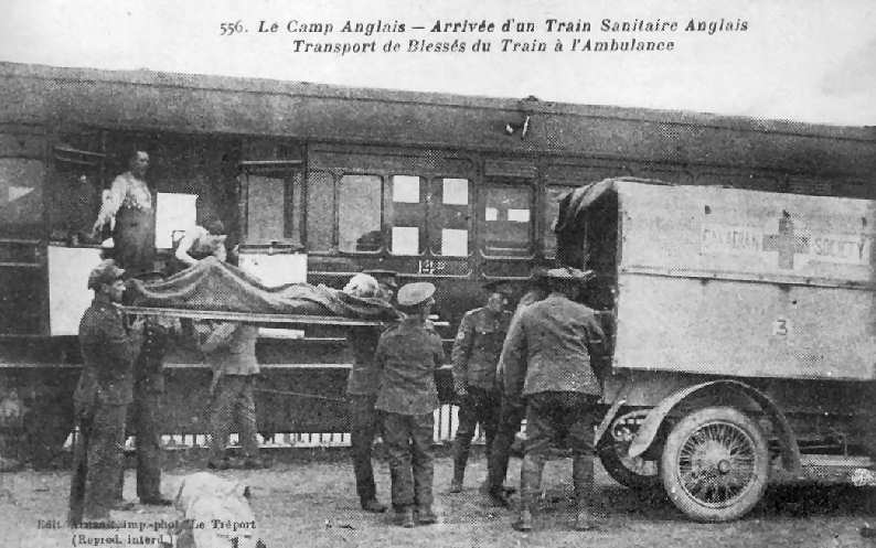 The wounded arrived by train and were transferred to the hospital by ambulances.