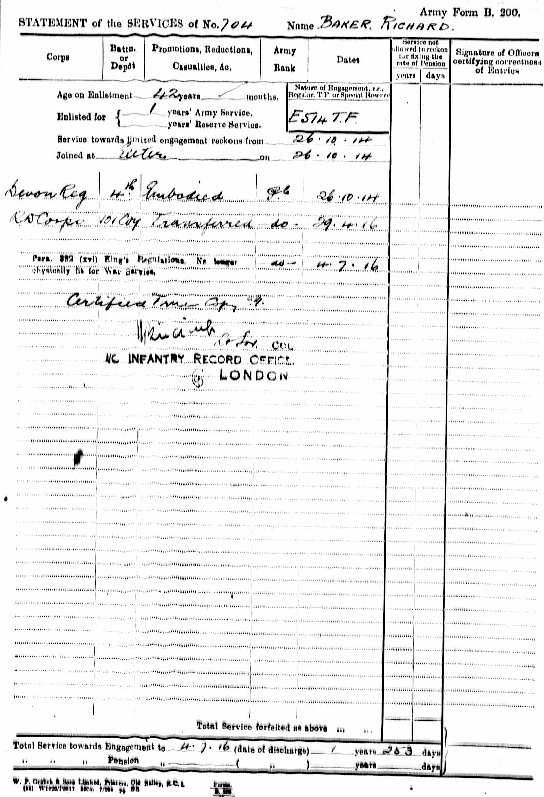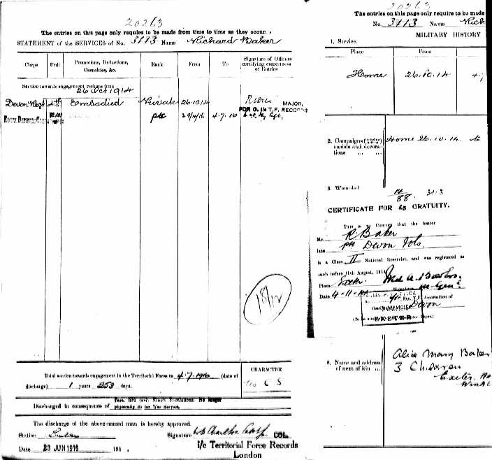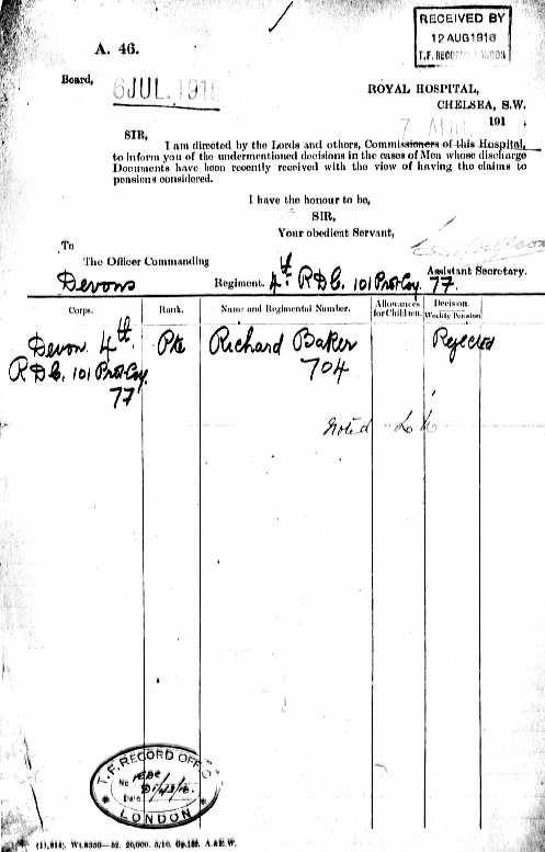The final document that illustrates Richard’s war service is dated 6th July 1916 when at the time of discharge he applied by letter for a pension to the Royal Hospital, Chelsea, an application forwarded to the O/C 101 Protection Company, 4th Devons. Needless to say the application was rejected, but we can be thankful that the attempt was made. As a result, Richard Baker’s military documents were preserved in Pension Records, and so escaped the London Blitz which had resulted in the destruction at Somerset House of some 75% of the records of soldiers who had served in the First World War.