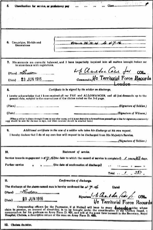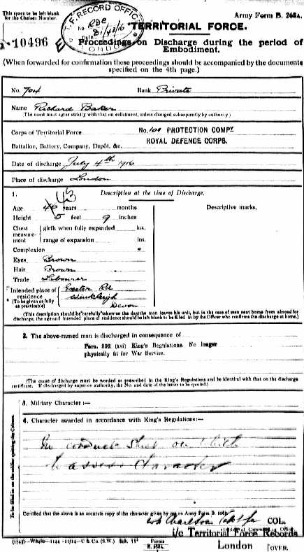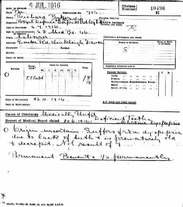 Richard had now served for 1 year and 253 days, but felt he was no longer strong enough for the training and the parades that were required. On October 26th 1914 he had appeared before a medical board in Exeter, and the certificate shows that he had been passed as fit, but for discharge on July 4th 1916 he had to go to London to be examined, on 23rd June 1916. He had written down his age as 46 for the occasion, but the matter was corrected. Described as ‘prematurely old and decrepit’, he was classed as medically unfit to serve, stressing ‘deficient teeth and chronic dyspepsia, the origin of which was uncertain’.
