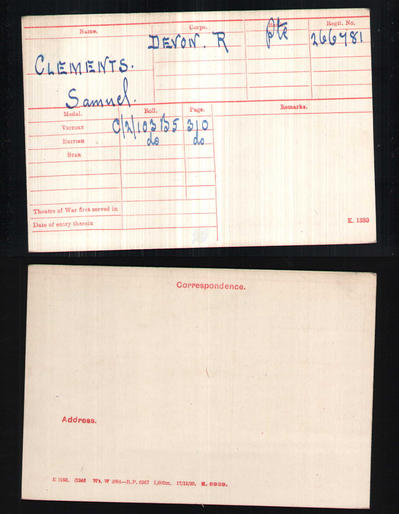 Little is known at the present time about the military history of Samuel Clements, apart from his medal card. His service records were lost, as with so many others, in the London blitz and there are no pension records to help us out. Awarded the Victory and British medals, we know that his army number shows that he joined as a ‘regular’ rather than as a ‘territorial’. However, we are helped by a report in the ‘Western Times’ for 3rd December 1915 which reads: Winkleigh. Two more recruits for the army proceeded from this parish last week, viz. Samuel Clements and John Ellacott.