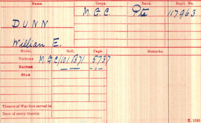 Unfortunately, nothing is known up to the present of this man from any of the available records. There were certainly Dunn families living in Winkleigh, but by the time of the 1901 census they had all moved away, so we can only suppose that this W.E.Dunn came to live in the Winkleigh area in the years just before the war. His service records have not survived the London blitz, and though there are a number of medal card records of persons named William Dunn in the Machine Gun Corps, there is only one card for a William E. Dunn in the Corps. This card can be seen on the right. There are no war-pension records for a W.E. Dunn in the Winkleigh area. We can only hope that before long we will be contacted to add further details to this page.