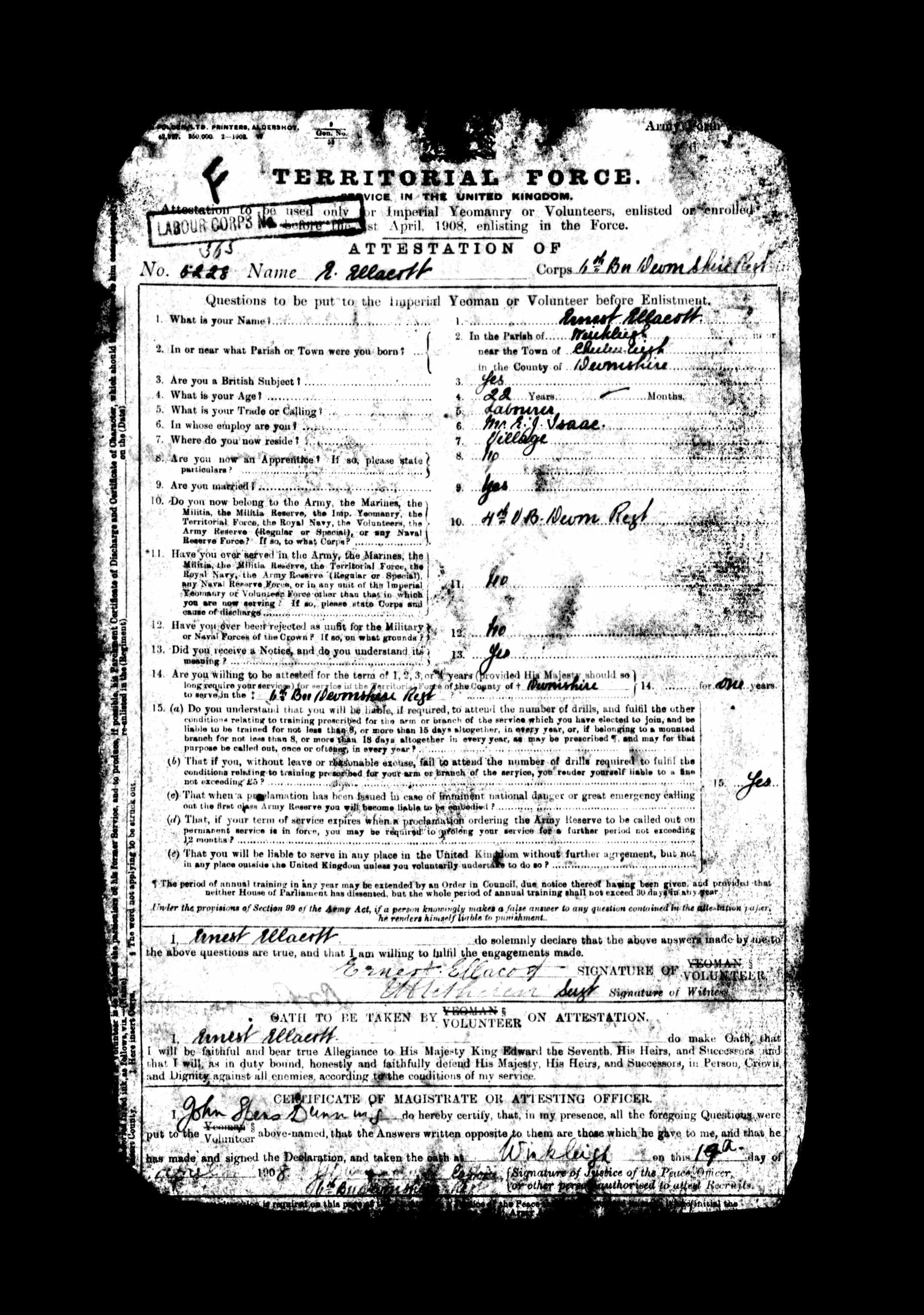 We are extremely fortunate to have a complete history of Ernest’s long army career from the time when aged 20 he first joined the 4th Volunteer Battalion of the Devonshire Regiment on 1st March 1906 with the army number 363, up to the time when he was finally demobbed in 1919. These documents have survived the London blitz which destroyed so many of the soldiers’ records because after the war he applied for a pension and the documents were transferred from Somerset House to the Ministry of Pension records where they survived the bombing. Ernerst’s story is particularly interesting because it is an excellent example of how older soldiers, too elderly to the sent to the front line, nevertheless were given useful work in the army support services. Willingness to enlist, or re-enlist, in 1914 was no less patriotic and valuable as it was for the thousands of younger men who rushed to enlist in the Territorials or Kitchener’s New Army at the start of the war.