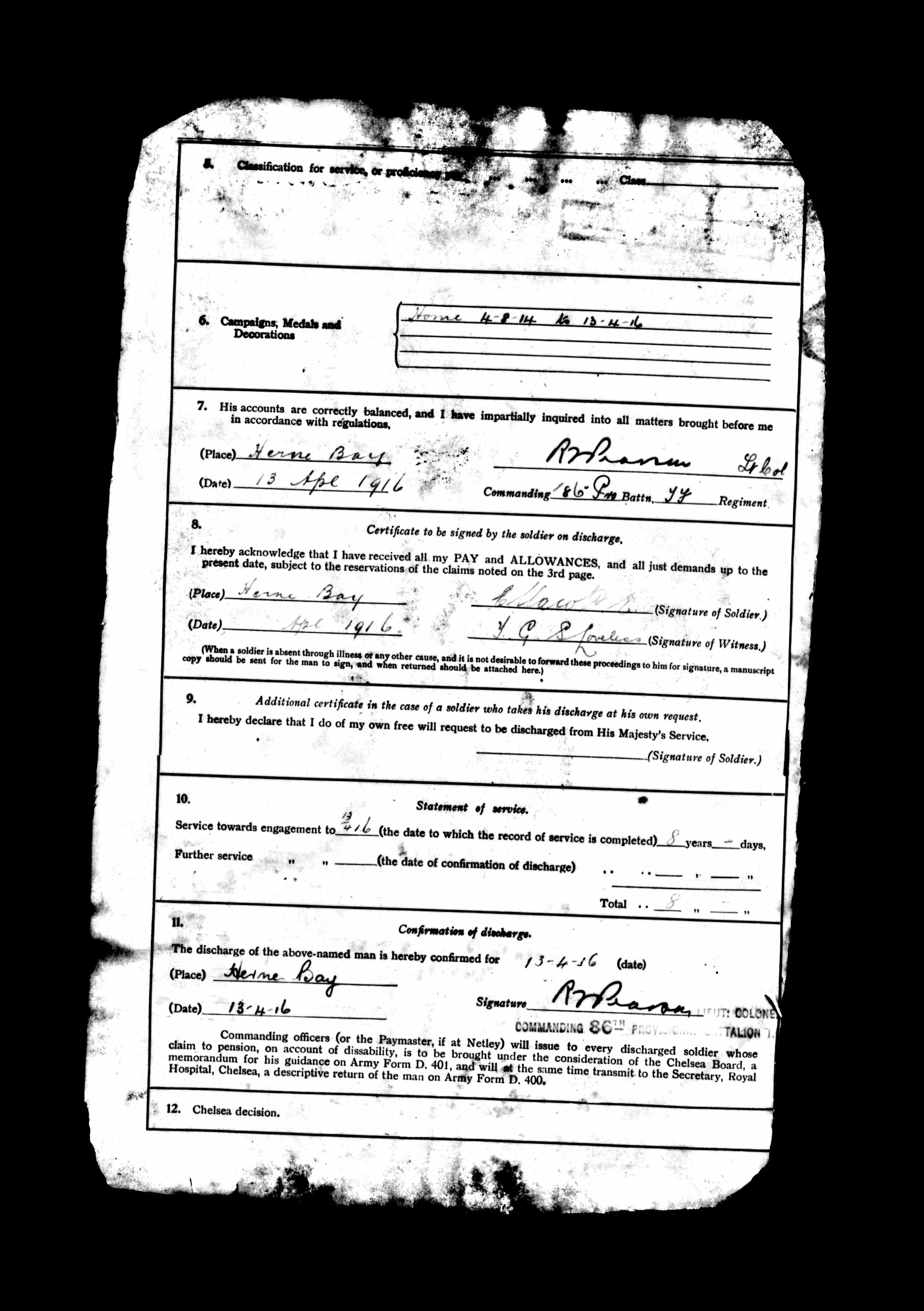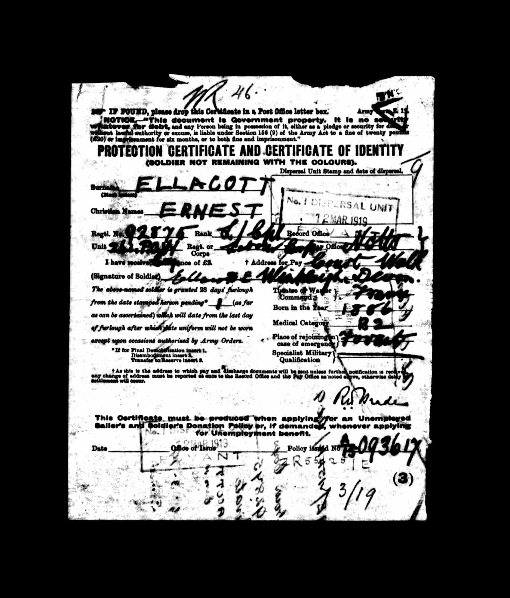 Ernest’s documents have survived because a full two years after demobilisation he had applied for a pension, on the grounds of suffering from sciatica, presumably blaming the onset as a result of his war-work. No record was made of the cause, but the disability was regarded as 100%. An assessment was made and Ernest was awarded 40/- a week in abeyance and thereafter for 18 months. A further assessment was made on 13th December 1922 and the allowance was renewed for a further 13 months. On 13th December 1922 the sciatica was finally marked off as ‘non-attributed’ and ‘non-aggravated’, signaling no further grounds for any renewal of the award. Armed with the 1919 Protection Certificate issued to all troops proving that they were properly demobbed and not deserters, Ernest could finally retire from army life. His record was blameless, he had served his country for 11 years, both in the Territorial and the Regular Army, and Winkleigh could be justifiably proud of the example he had set to his family and to the village.