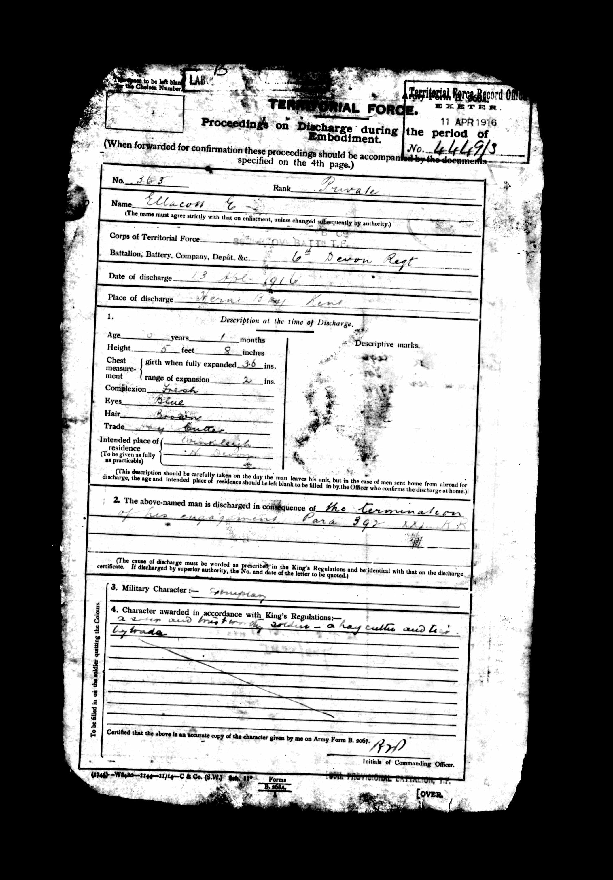 Ernest Ellacott was born in April 1886, the son of Thomas Ellacott, a butcher in Winkleigh and his wife Elizabeth, who in the early years of the century is described as a laundress. The 1901 census records the family as living at Denis’ Cottage, with four children - Emily aged 17 (helping her mother in the laundry business), Ernest aged 15 and working as a labourer, Edith aged 7 and Winifred aged 3. Ten years later the family had moved into the Exeter Road. Elizabeth was now assisting in the butcher’s shop, and other children listed in the 1911 census were William aged 39 who with his daughter Elsie aged 6, had returned to live with his parents, and was a cattleman, Florence aged 17, assisting at home, and Winifred now aged 13 and still at school. Ernest himself, aged only 18, had married on 29th October 1904 at the Register Office in Torrington and was living in Vine Street, with his wife Emily Ford and their two children, Ernest aged 6 and Ruby aged 3. In 1914 he was working as a general labourer for Mr. E.J. Isaac, on the farm at Loosedon Barton.