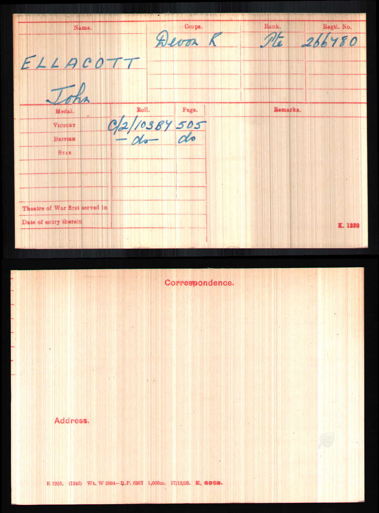 With a brother in the Devons, it is easy to understand why John was anxious to follow, though he probably waited as long as possible before being enlisted. We can now know that he enlisted voluntarily at the very end of the Derby Scheme, in order to be able to choose to serve with the Devons. The medal number reveals that he did not enlist in the territorials, but was classed as a regular. Of course this does not help us to know in which battalion he served or more of his war service, and sadly his military records were destroyed in the London blitz. The outline history of all the Devon battalions is attached on the right of this page, together with John’s medal card.