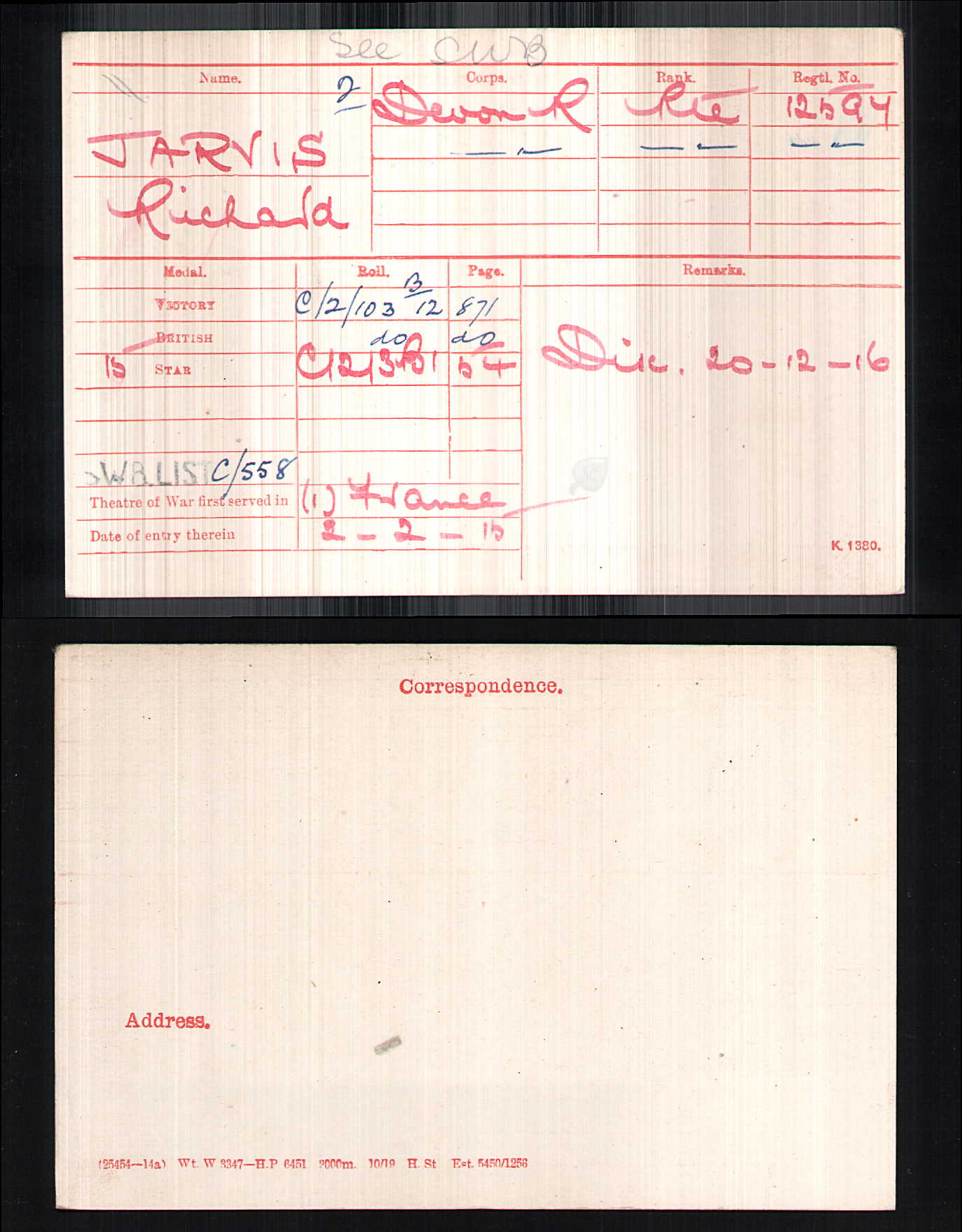 Turning to the entry on Richard Jarvis' medal record (see attached document) we must consider the addition of '9th Devons' to his service. This entry does not appear on his medal card, which seems to indicate that a posting to the 9th was very late in his service history. The huge casualties to the 2nd Battalion on July 1st 1916 indicate very strongly that wounded, Richard Jarvis was then hospitalised, re-graded for home service after recovery, posted to the 9th Battalion depot and then discharged in December 1916.