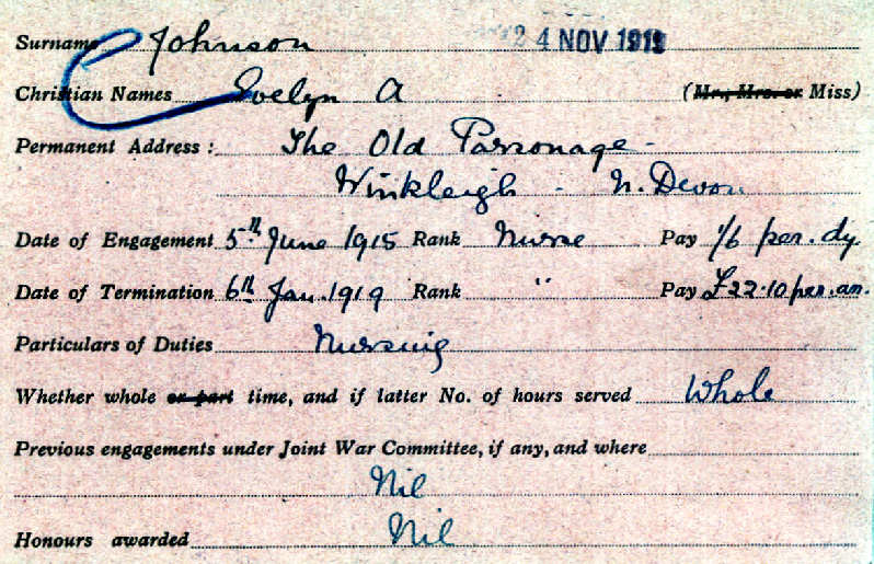 It is good to record that Evelyn Johnson lived a very long life, dying only in June 1988 in Surrey, at the age of 97. She survived as one of the very last of her generation of VADs, who gave so much and who contributed so profoundly to the care and comfort of the sick and wounded. Her commemoration is assured, not only on the Winkleigh Memorial Roll of Honour, but also in the memory of those who treasure the history of Winkleigh and the contribution that was made by so many of those who lived there in the Great War.