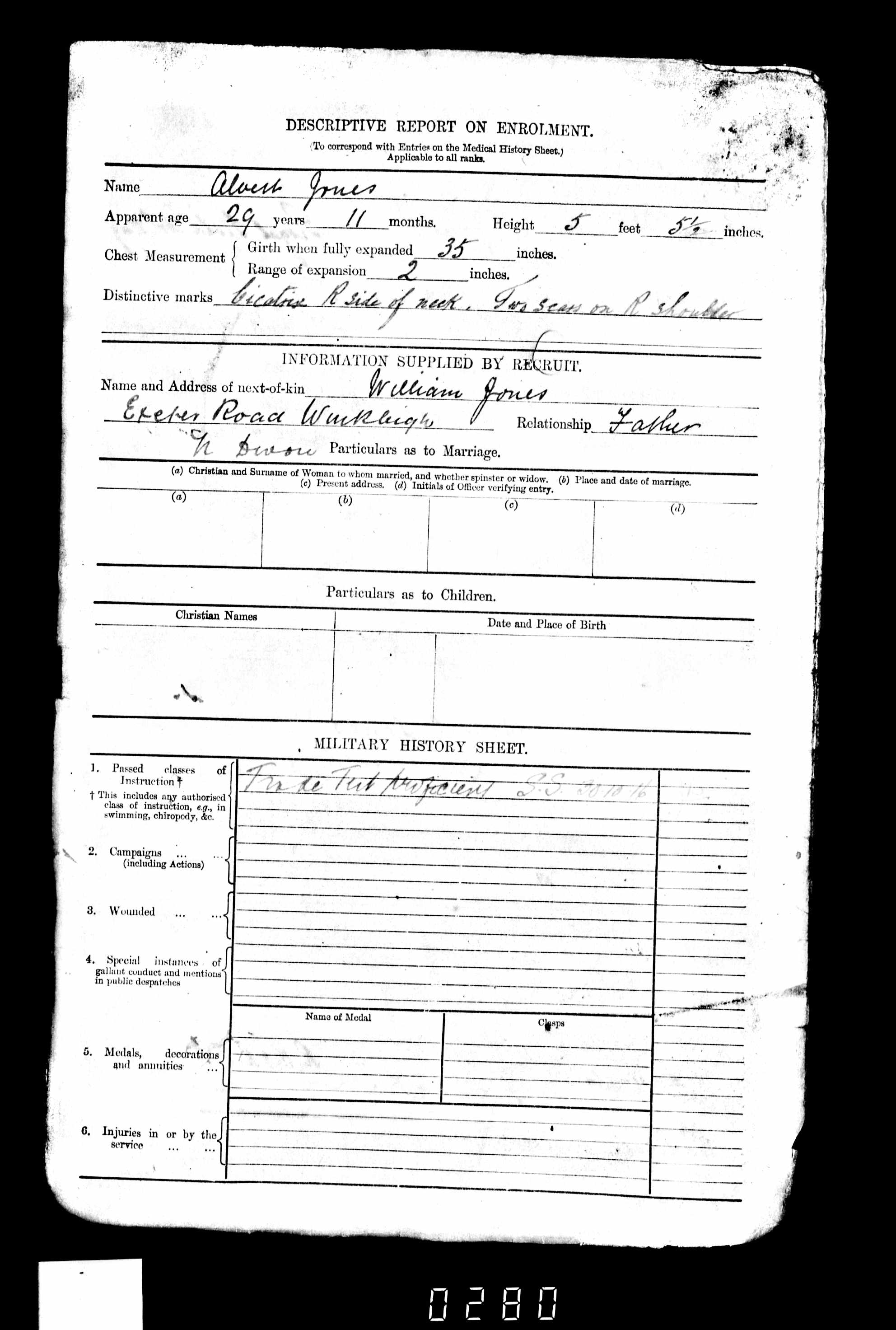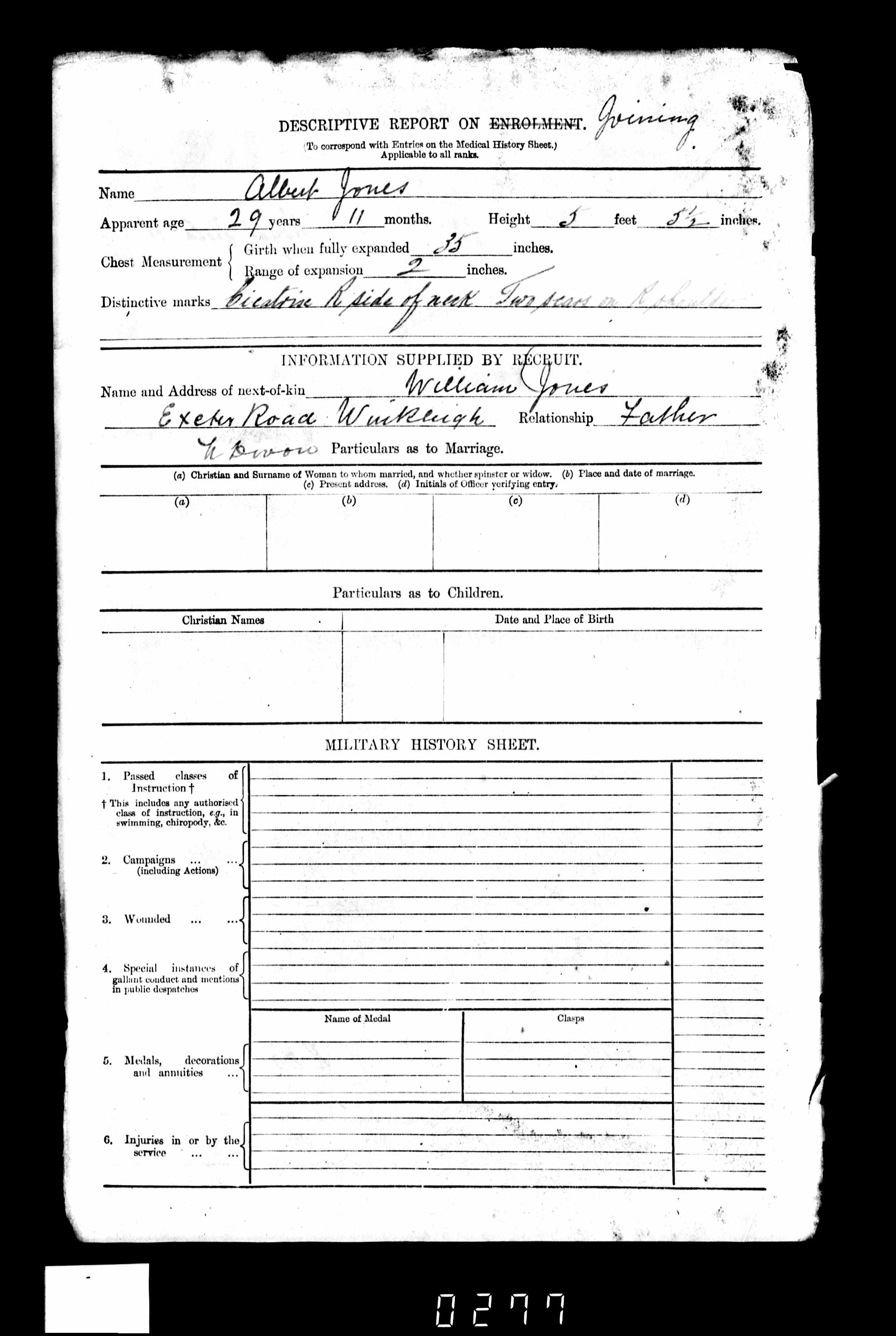 Albert Jones was born in 1886, the son of William Jones, a blacksmith who in 1911 was living with his wife Mary on the Exeter Road. An unmarried elder sister, Bessie, born about 1877, completed the household. Albert followed his father’s trade as a blacksmith, a vital occupation in a farming village dependent entirely on horses.