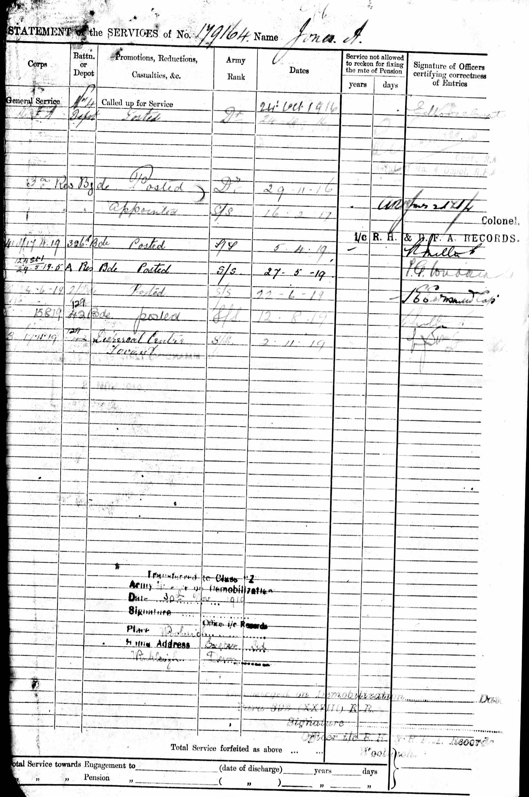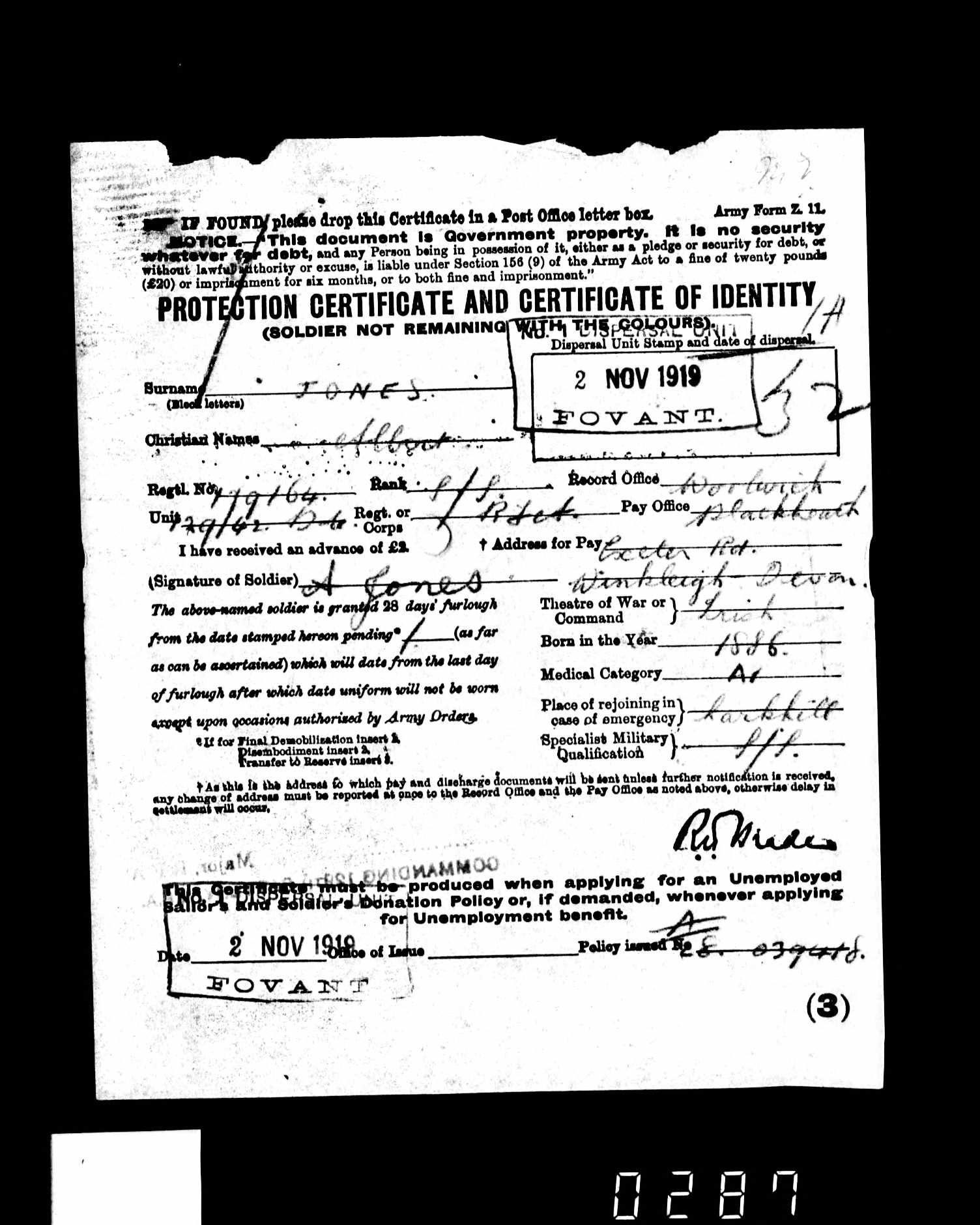 A shoeing smith would usually be needed in any unit right up to the time of the final demobilisation programme. Interestingly, Albert’s Protection Certificate, Document 9 (issued on demobilisation to all men, proving their discharge) mentioned Ireland as the Brigade Headquarters. This means that at some time after March 1st 1919 the 42nd Brigade had been posted from Germany to Ireland. The 42nd Brigade was part of the pre-war Regular Army, and obviously remained so, although it seems likely that the attached 129th Battery (Howitzer) was withdrawn or disbanded, which of course would open the way for Albert Jones’ demobilisation. He was posted to 3A Reserve Brigade at Larkhill on 27th May, and on 12th August posted to the demobilisation camp at Fovant where he had to wait his turn. Demobilisation finally took place on 2nd November 1919. Albert was given 28 days’ paid leave and £2 advance of pay, together with a rail warrant to return to Winkleigh.