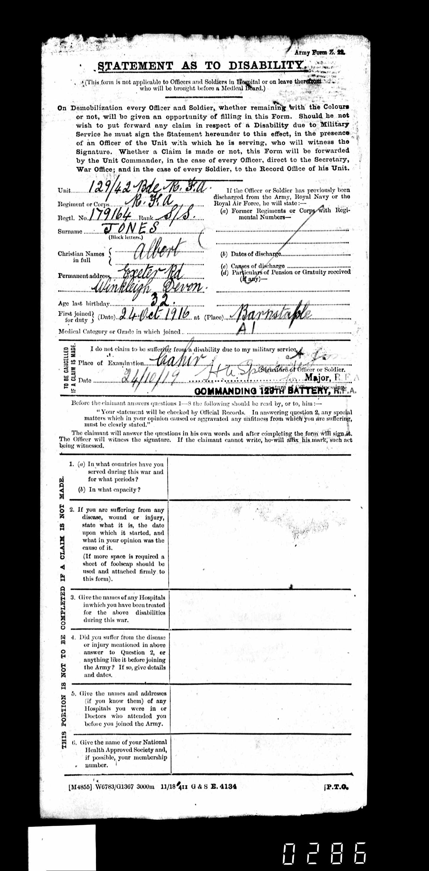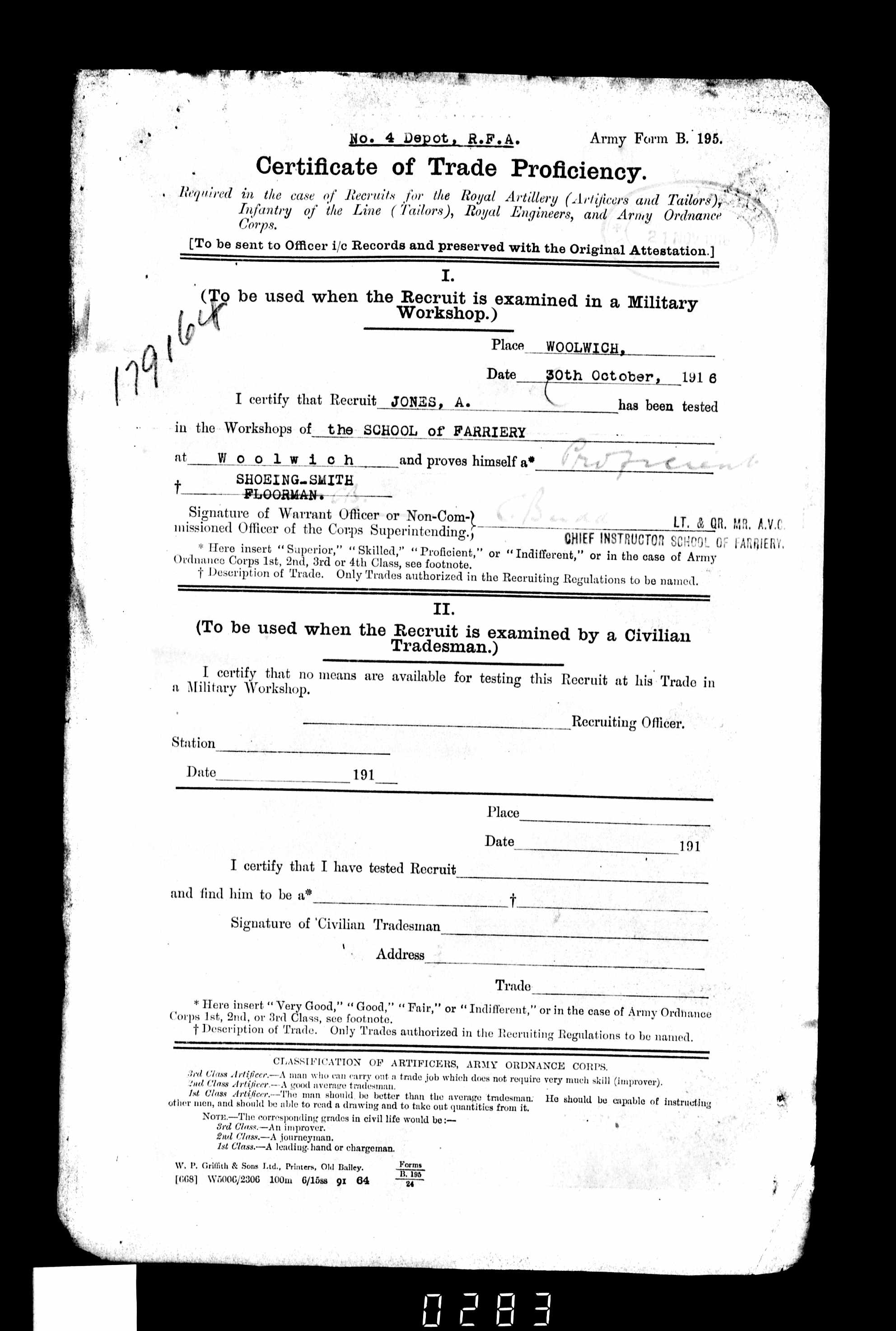 We are extremely fortunate that a number of Albert’s army documents have survived from among the majority of those destroyed in the London blitz, and they give a clear picture of his service both at home and in France. The actual date of his arrival in France is not recorded on his medal card, but it is information we can see on his documents, and we know that he served in the war zone for just over two years. Albert was conscripted (Document 1) under the Military Service Act of 27 January 1916 which brought conscription into play for the first time in the war. It was extended and new conditions implemented in legislation of 25 May 1916, which was known as the Military Service Act, 1916 (Session 2). Together they were known as the Military Service Acts, 1916, to include all men, both married and single, who had been at any time resident in Great Britain since 4 August 1914 and who had attained the age of 18 but was not yet 41. A medical certificate was provided to complete enrolment, (Document 2). Men who failed the medical and enrolment were told they would not be needed again; those who passed, as with Albert Jones, were told they would have another medical when called up. The horse-drawn Royal Field Artillery was the most numerous arm of the artillery, responsible for the medium calibre guns and howitzers, deployed close to the front line and reasonably mobile. It was organised into brigades, with usually 4, but occasionally a varying number of batteries, within each brigade. A battery at full strength numbered 198 personnel (something equivalent to an infantry company within a battalion) which included the battery commander (usually a major), a captain as second in command, with three lieutenants or second-lieutenants each in charge of a two-gun section. To assist in the care of the horses each battery would include a farrier–sergeant and four shoeing-smiths. A howitzer battery would thus include six 5” howitzers, with 16 guns to the artillery brigade, each gun drawn by four to six horses. We are therefore looking at something like a total of 100 horses per battery to be fed, watered and looked after as carefully as possible.