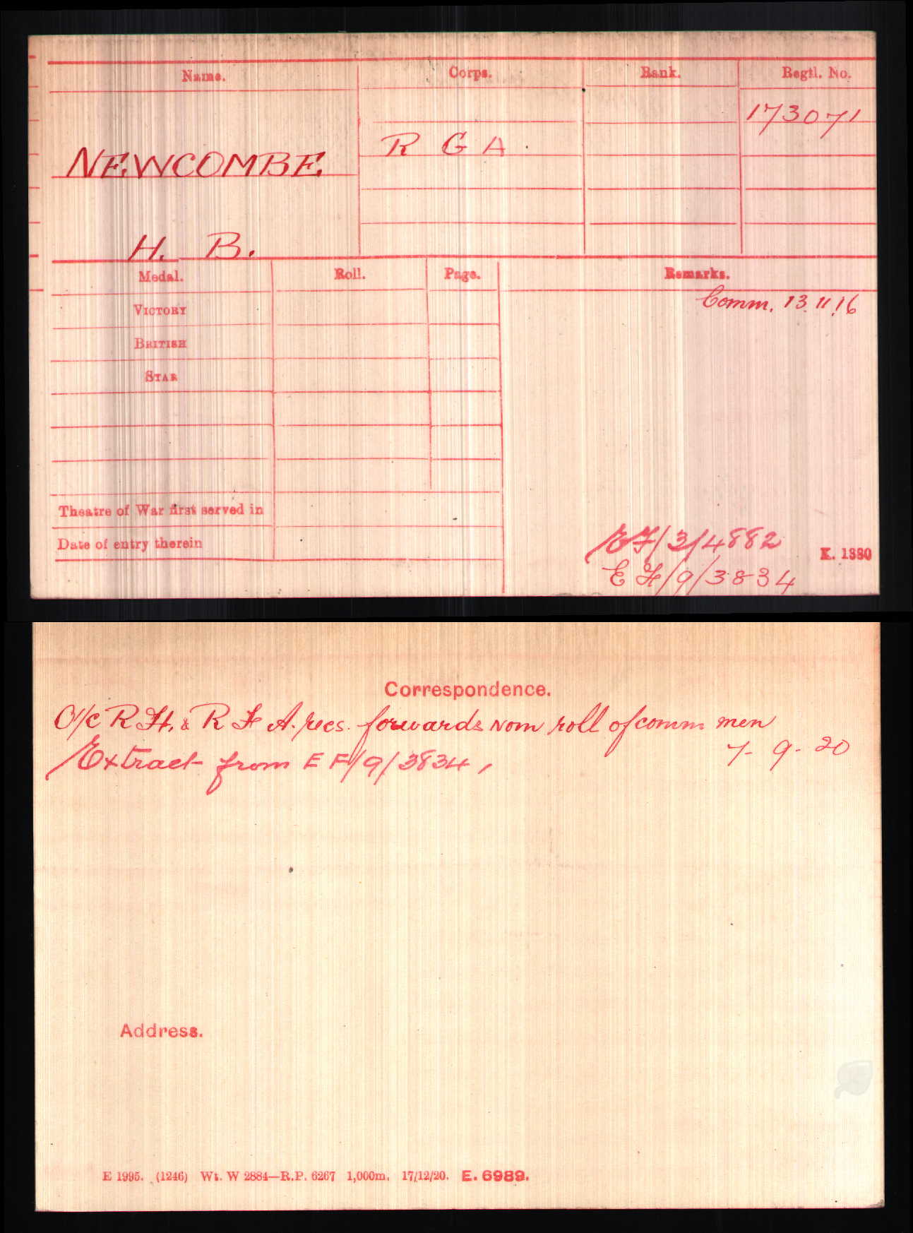 There are no surviving medal cards of an H. Newcombe in the R.G.A., apart from an H.B. Newcombe, R.G.A. who was commissioned on 13.11.1916. No military documents have survived. However, H. Newcombe’s year of birth, c.1875, would mean that he was about 39 when war broke out. Men in their forties were certainly conscripted by the end of the war, but the absence of a medal card could indicate that H. Newcombe never went abroad but was perhaps given a job on coastal defences.
