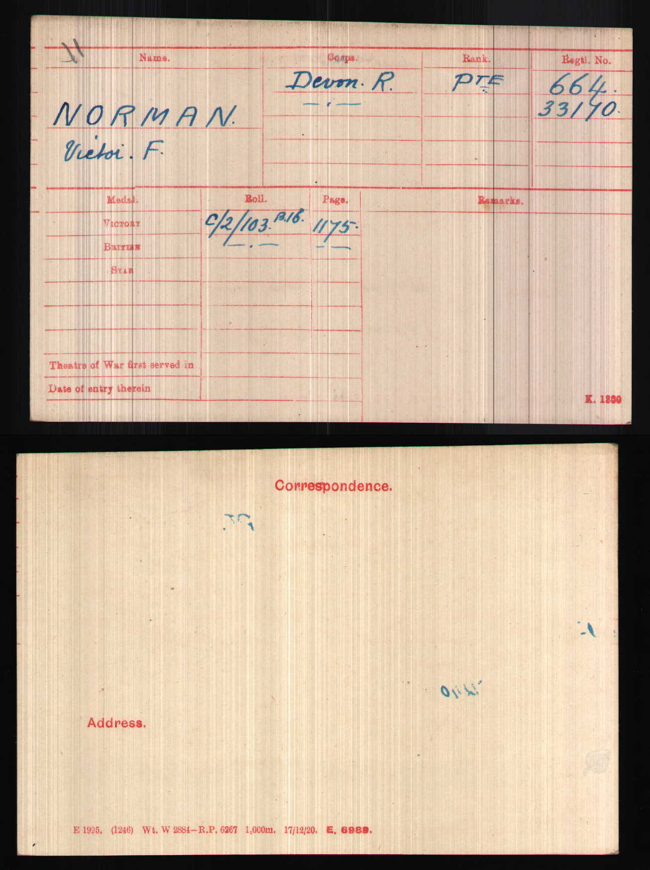 F. Norman thus remains a mystery. A choice of 4 ‘Norman’ medal cards in the Devons on offer give no positive identification and none with ‘F.’ as the first name. There are no surviving military records.