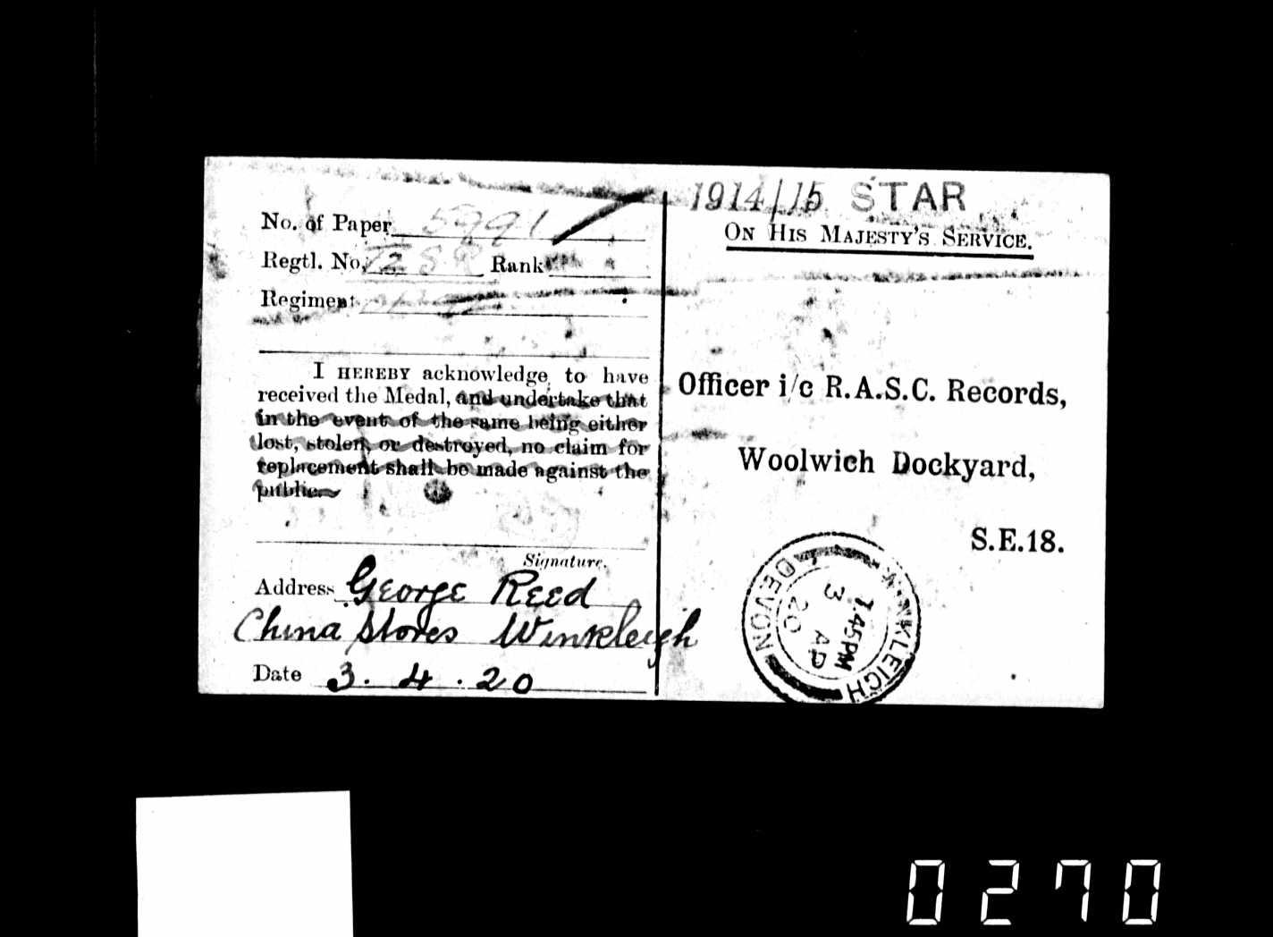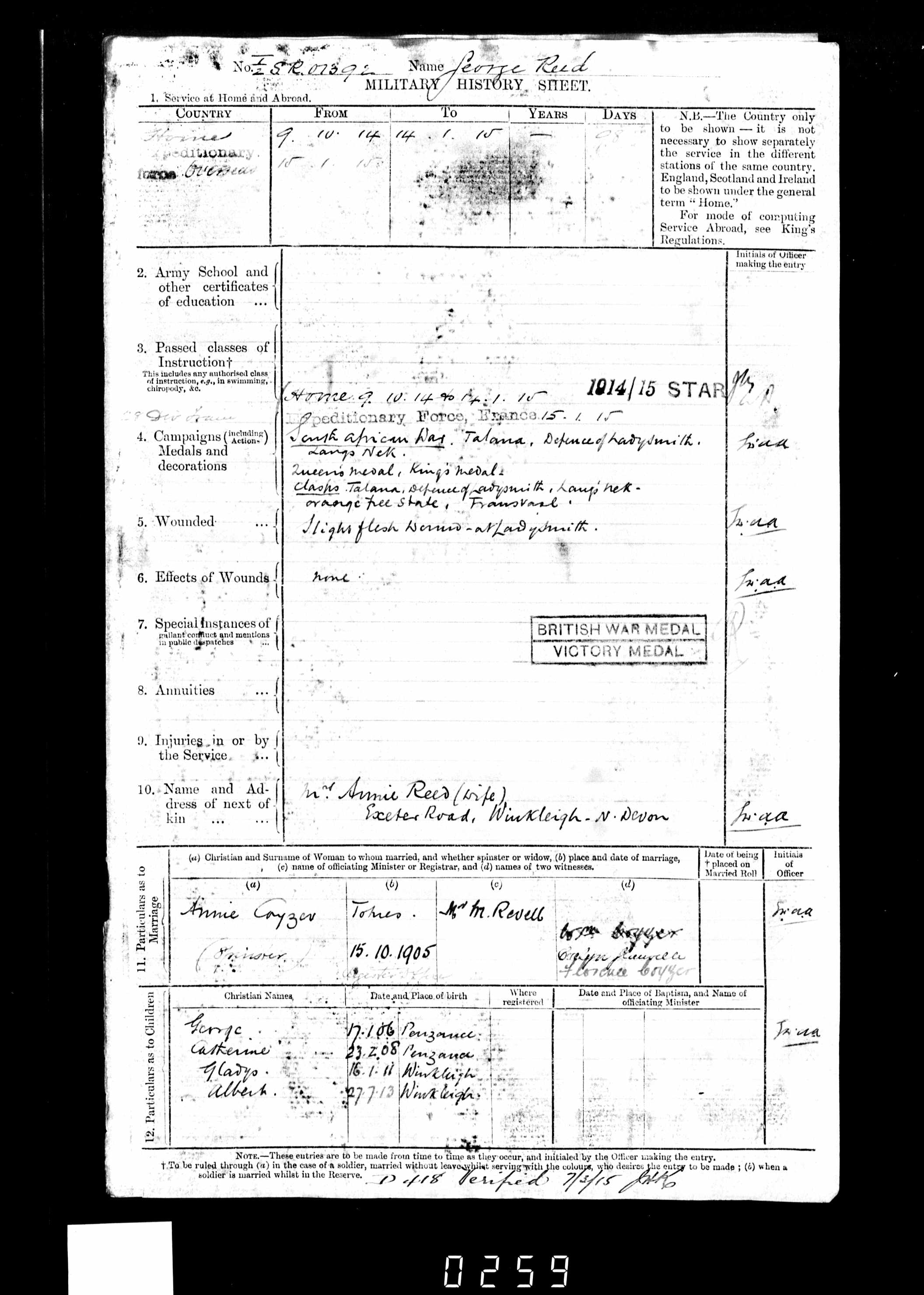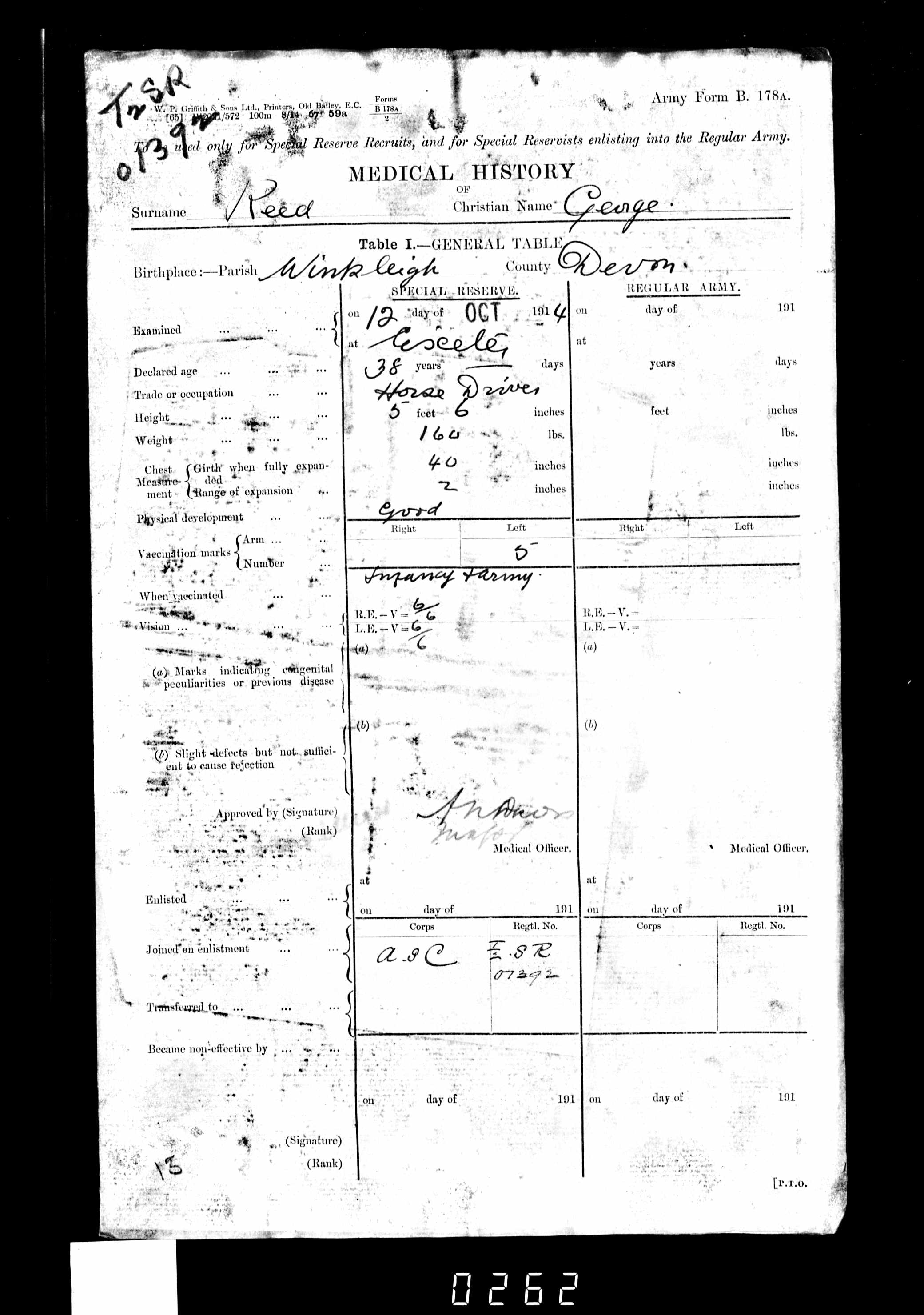George Reed was a distinguished soldier, a veteran of the Boer War, and whose name is proudly recorded in the Chumleigh Deanery Magazine as having re-enlisted as a reservist in the first months of 1914. Obviously a very fit man, he was (according to the 1911 census) already 40 years old when war began, but in order to serve, George stated that he was only 38. We are extremely fortunate that not only his medal card but an almost entire set of documents relating to his full army career and war service have survived the bombing which destroyed so many priceless archives, and from these the full picture emerges.