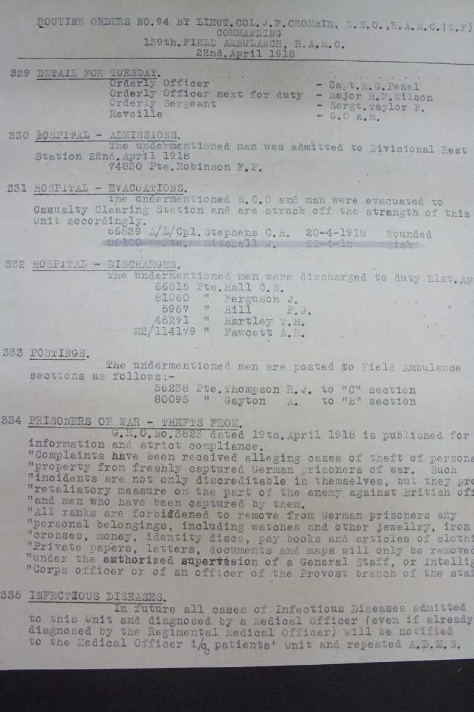 66839 Acting/L.Cpl Stephens C.H. wounded 20.4.1918 and 86100 Pte. Mitchell J. sick 22.4.18.’