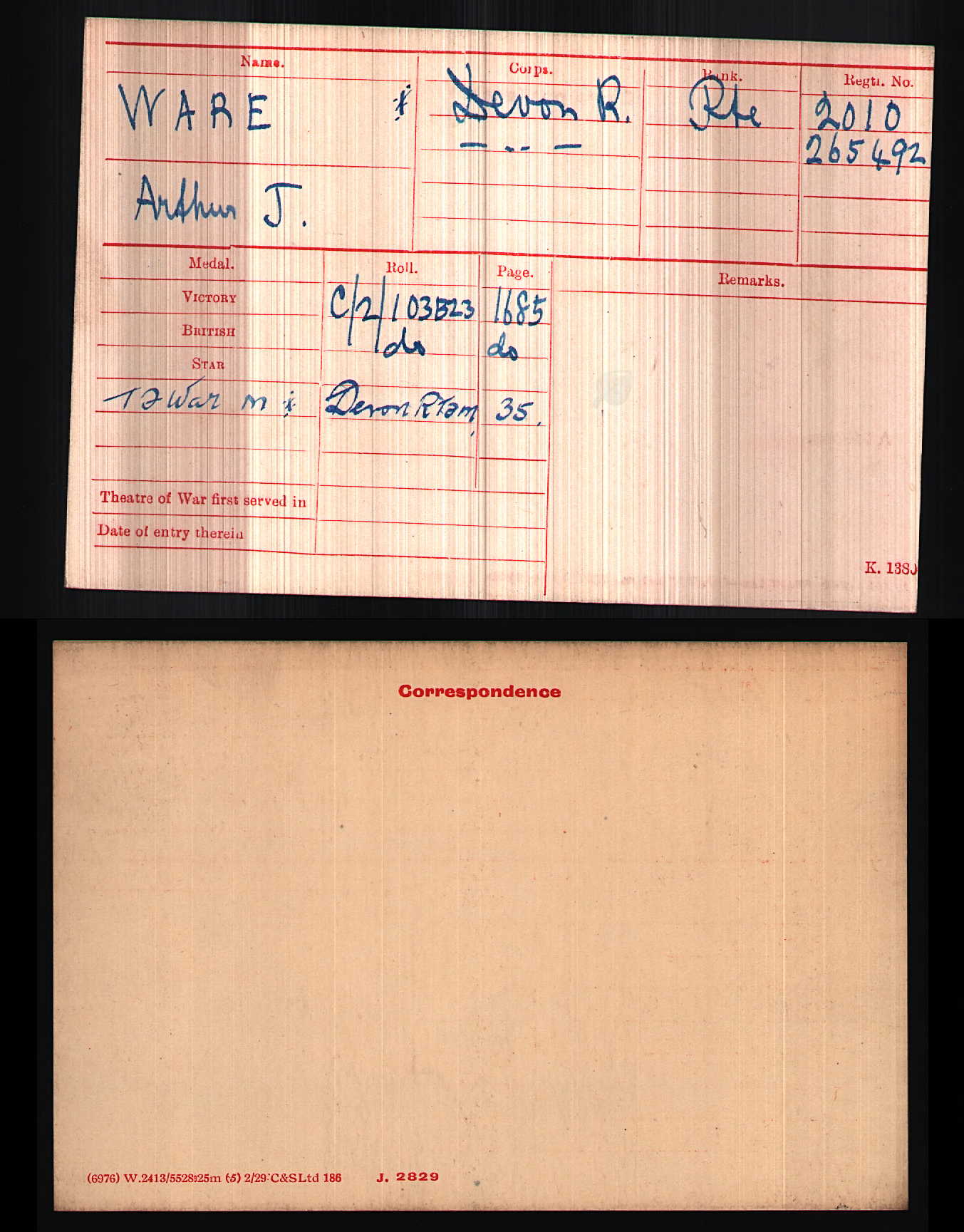 Arthur Ware was the youngest son of Thomas Ware, a skilled farm labourer, and his wife Ellen who had been born in Coldridge. In the 1901 census Thomas is described as a ‘yardsman’, with four sons and a daughter, Bessie. Three of the sons, William, Ernest and Arthur all went on to serve in the Devons, a proud record for any family, and all survived. Rising three years old in 1901, Arthur was 13 in 1911. The Winkleigh school records show that he left school a year later aged 14. His father showed his employment certificate but sadly we do not know what this was. Aged only 16 on the outbreak of war. He immediately followed his brothers into the 6th Devons and his name proudly appears in the October 1914 edition of the Chumleigh Deanery Magazine in the list of those already serving from Winkleigh. We do not know if he lied about his age: Arthur’s military documents did not survive the London blitz.