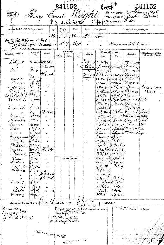 Henry Ernest Wright was born in Exeter on 14th February 1878, the fourth of the seven children of William Wright. William had come to Exeter from Teingcombe to work as a cook, where he married Maria Standlake, the daughter of an accountant. Henry joined the Navy as a cooks mate when he was just 18. It is not known how Henry became associated with Winkleigh as his family remained in Exeter (with a short stay in Dartmouth) until after his father died when Henry was age 21. There seems to be no family connexion with Winkleigh, although Henry may have moved his family to Winkleigh sometime after 1911, or his mother may have moved there after all her children married.