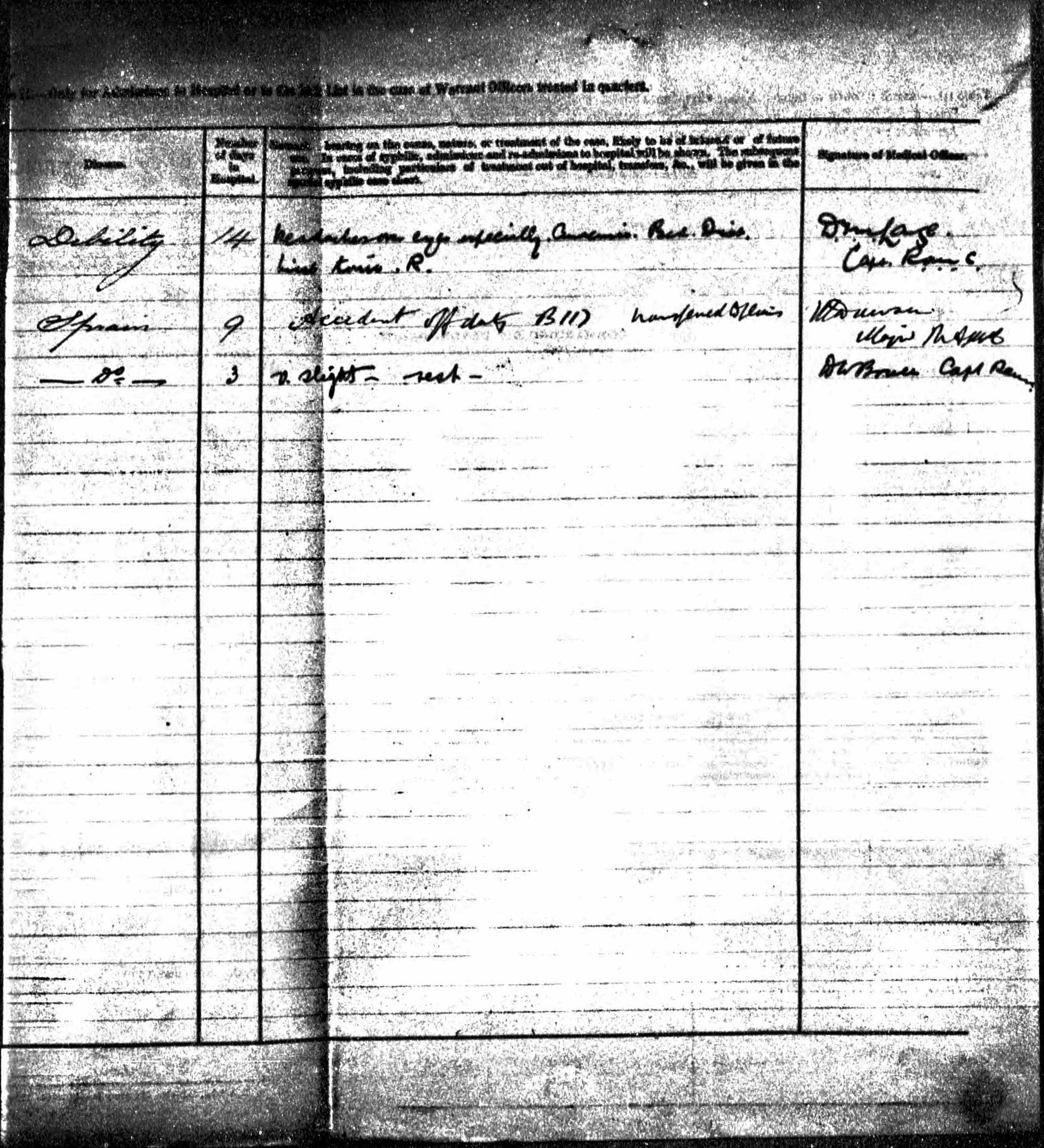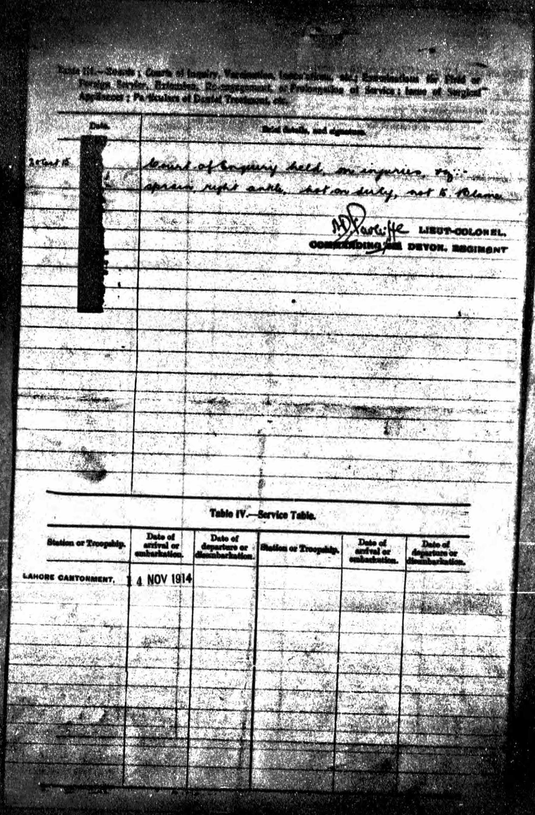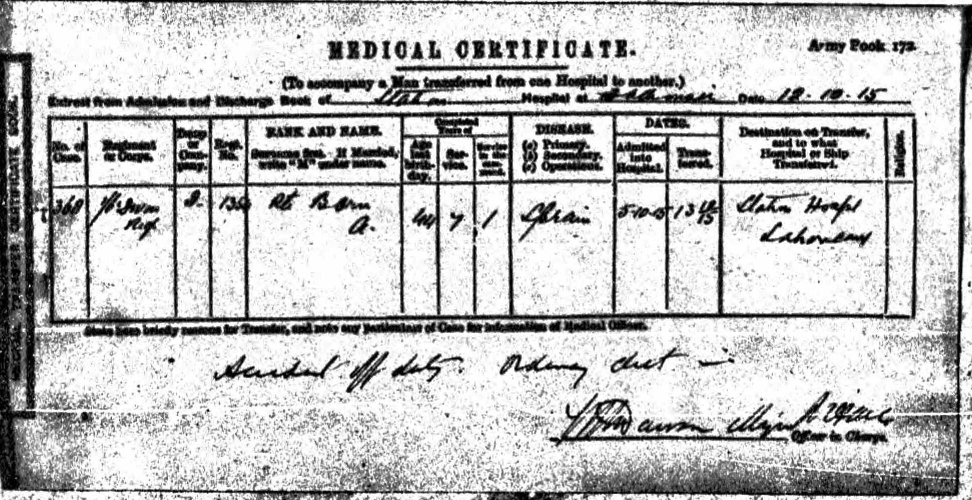 Arthur Born remained behind in India, (Document 4), not medically fit or too elderly for service in Mesopotamia, and remained there until 10th February 1916 having presumably transferred to the 2nd/6th Battalion. Document 6 shows us the story. Document 7 shows that he was twice in hospital at Dalhousie, first from 8th – 21st September 1915 with an eye problem and shortly after this he sprained his foot off duty and was back in the Dalhousdie hospital for nine days from 5th to 13th October 1915, followed by rest in the cantonment for 3 days until 16th. Document 8 gives the details, and Document 9 reports the Court of Enquiry in which he was exonerated from blame - the army being careful to prevent self-injury or malingering. A medical certificate dated 18th October 1915 returned Arthur to ordinary duty (Document 10).