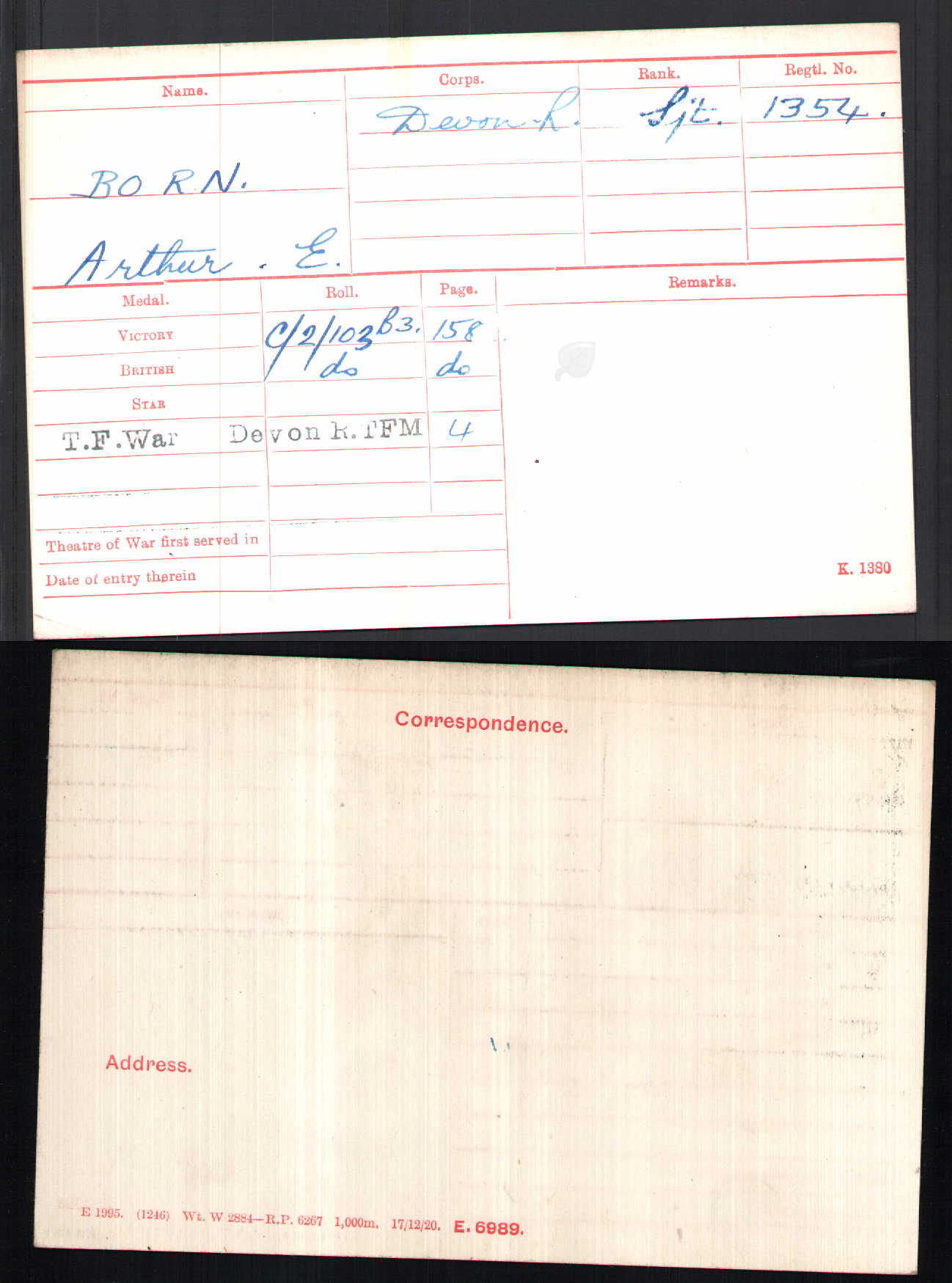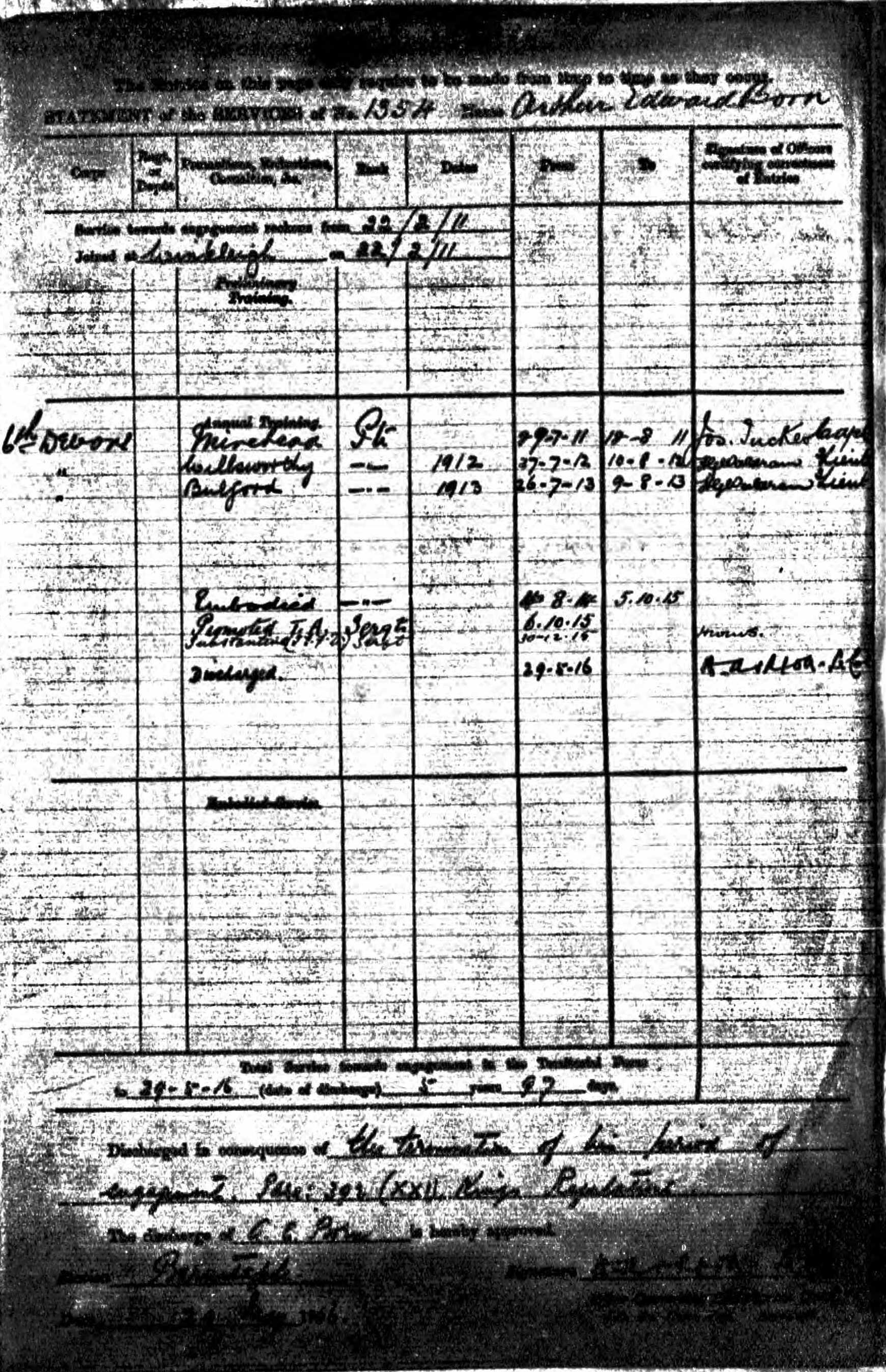 Arthur Born’s name does not appear on the Winkleigh Roll of Honour displayed in the church. However, his name is listed in the Ashreigney Deanery Magazine for September 1914 as one of the very first Winkleigh men to serve, and we think that his connections with the village justifies the inclusion of his record on our site.