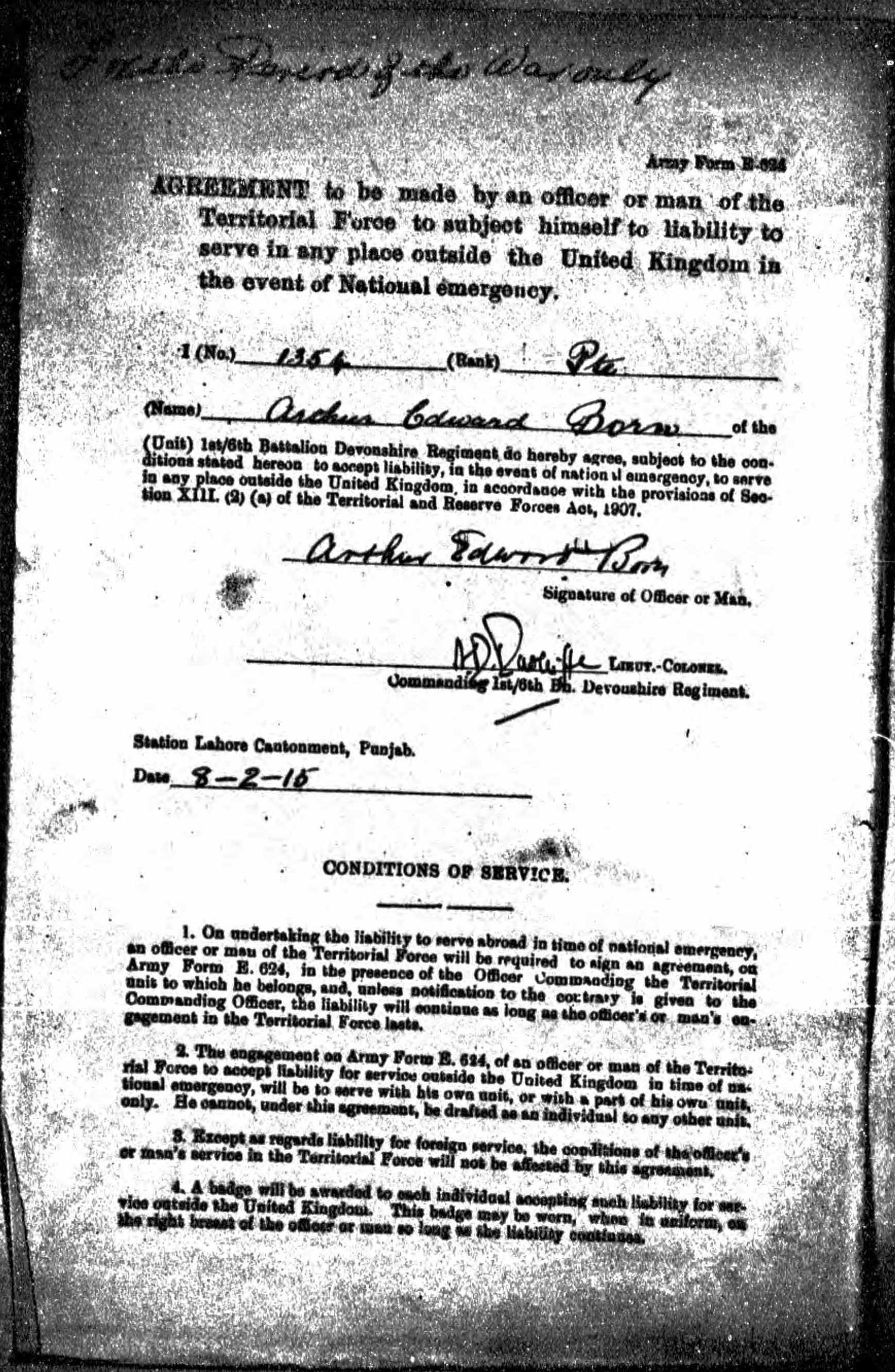 Arthur Born soon followed the battalion out to India. Document 9, the Service Table, records that he embarked on 14th November and joined the battalion at the Lahore cantonment on 20th December 1915 (Document 4). Here, Document 5 shows that on 8th February 1915 he signed the agreement to subject himself to overseas service: he had not done this, of course, in August 1914 and the official paperwork had been neglected later. Arthur was obviously a very useful late addition to the service in India: on 6th October 1915 he was promoted to Sergeant (Document 3).