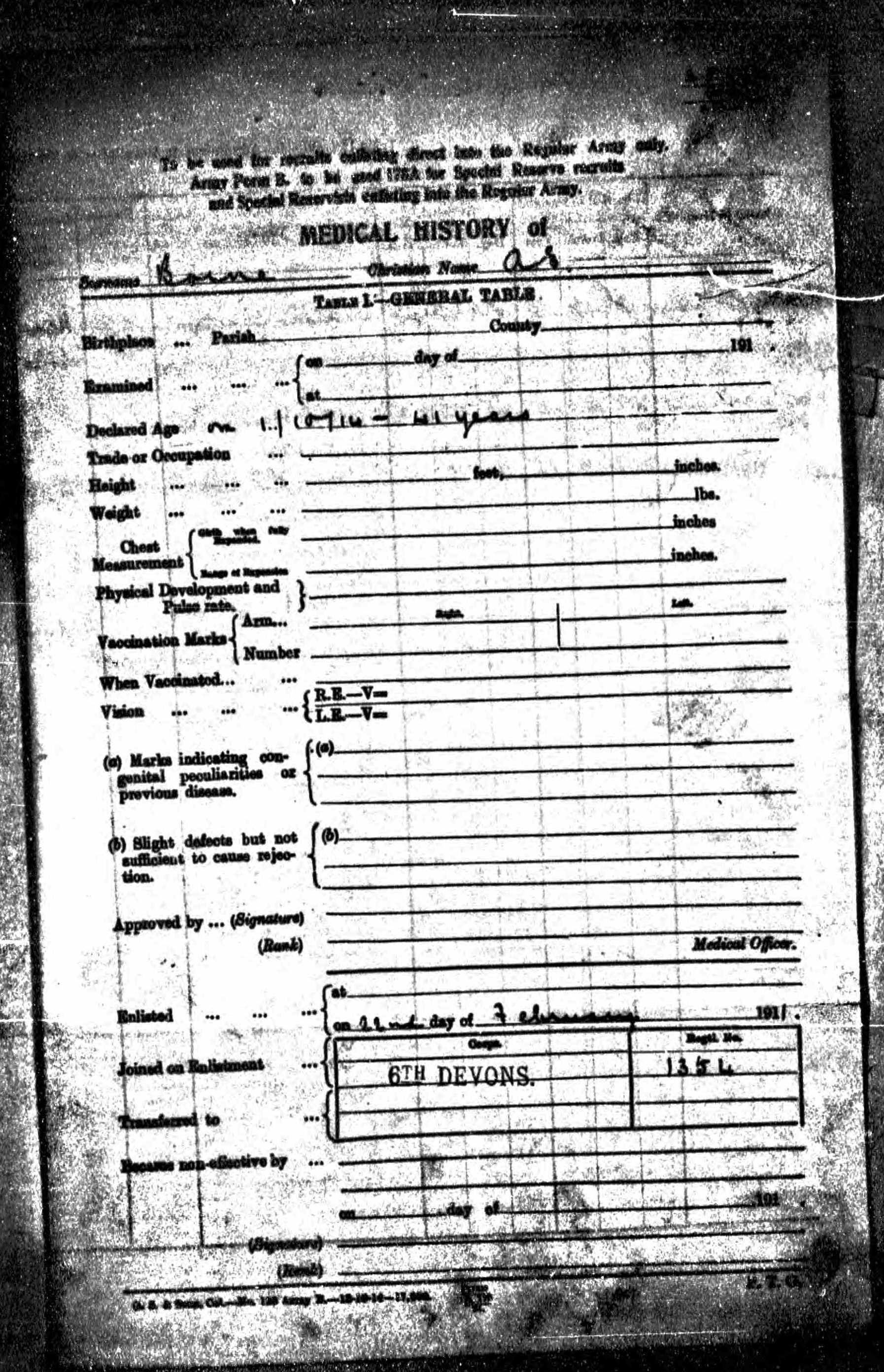 Document 1 shows that Arthur attested to join the 6th Devons Territorials on 22nd February 1911 at Winkleigh. His occupation as a postman, residence in Wembworthy and age 38 are recorded. His medical, Document 2, the second page of the attestation, records his health as good in all respects. Document 3 is his service record, recording his annual camps: 1911 at Minehead, 1912 at Willsworthy and in 1913 at Bulford Barracks on Salisbury Plain. On August 4th 1914 the battalion was encamped for the annual summer camp at Woodbury Down, from where they moved to Fort Renny, Plymouth on 9th August, where they were embodied by law for the duration of the war on 4th August . It very soon became apparent that in spite of the fact that the Battalion could be classed as no more than only very partially trained, they were going to be asked to volunteer for overseas service. This was certainly not what the Territorials had been enlisted for, having been repeatedly assured they would only be required for home-service. In fact, the vast majority was eager to go and if they had not been given the opportunity many would undoubtedly transferred to the regular or New Army battalions, thus ruining a fine and established Territorial battalion. By mid-August the change had been made, and the vast majority of the 6th stepped forward to volunteer to a man, though quite a number failed to pass the required medical tests. Those who did not, or could not volunteer returned to Barnstaple to form a second line nucleus, the 2nd/6th Devons. For the time being Arthur decided initially to remain at home.