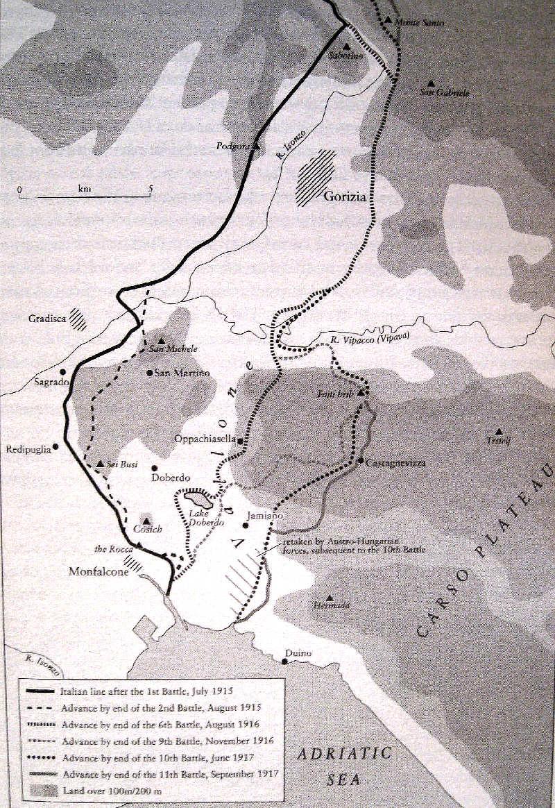 The town of Gorizia, well defended on the western side by three mountains, of which the highest is Mt. Saboyino (609 m.) lies on the edge of the Carso, an infertile limestone plateau stretching south from Gorizia to the coast, 100-200 metres above the river Isonzo. The Carso was a huge defensive barrier with innumerable bunkers and gun positions dug into the limestone rock. North of Gorizia is an equally foreboding plateau, the Bainsizza, less well defended, but leading nowhere. It was not until the 6th Battle of the Isonzo, in August 1916 that the Italians captured Gorizia and pushed the front line to the edge of the Carso, but little progress was made in the following three battles. Italy was desperately short of heavy artillery, and General Cadorna appealed to the British and French for support, to prepare for the 10th battle.