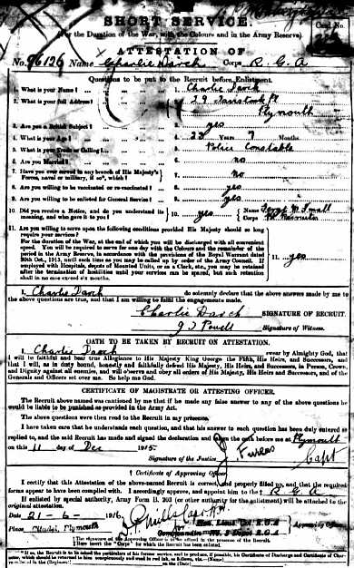 Living at 29 Tavistock Place, Plymouth, and working as a policeman, Charlie was faced with the prospect that as the war progressed it would eventually become necessary for conscription to be introduced, and that despite the fact that police work might well be regarded as a ‘reserved occupation’, he might very soon find himself drafted. It is astonishing to realise that the huge casualties of 1914, together with the battles of 1915, the catastrophe of Gallipoli and the dreadful losses in Mesopotamia were all fought by British and Empire volunteers. But by late 1915 the old pre-war army had gone, the Territorials were all in action and the first Divisions of the New Army had already been devastated. Conscription was a very unwelcome and political nightmare for the Asquith government, since compulsory service had always been largely regarded as a ‘continental’ and not a ‘British’ way of organising the military, and there was huge opposition in the country to its introduction. A compromise had to be found and the answer was the ‘Derby Scheme’.