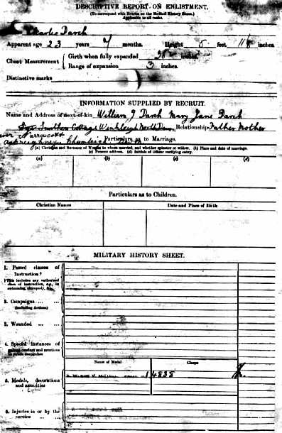 Charlie Darch was born in 1893, the seventh in a family of eight children, the son of William Jesse, a farmer born in Winkleigh, who in 1878 had married Mary Jane Cornall, born in Chawleigh, and who was service at the age of 12. It was a crowded household. The first child, John, was born ca. 1879 in Chawleigh, but then it seems that William and Mary Jane moved to Dawlish where Emily (c.1882), William Robert (c.1884), Lillian (also c.1884) and Hilda Annie (1889) were all born. By 1890 it seems that the family had returned to Winkleigh (confirmed by the 1891 census) where Florence was born c.1890 followed by Charlie in 1893 and Frank in c.1900.