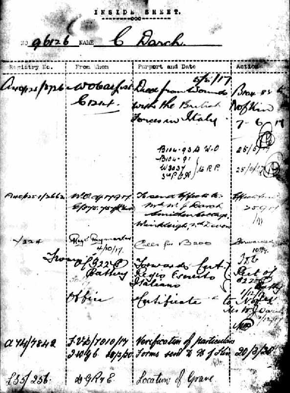 Having attested on 11th December 1915 the document ‘Statement of Services’ gives us a record of what happened next. Unmarried, at the age of 23 years and 7 months, Charlie might have expected a fairly short wait before enlistment but in fact it was a full six months before he was called up. Officially in the ‘army reserve’ he was mobilized on 15th June 1916 and posted for basic training to No.3 Depot, RGA, at Plymouth. This lasted 4 weeks, consisting mainly of drill, kit inspections, musketry, route marching and physical fitness – the usual introduction to army life. On 21st July Charlie was posted to ‘H’ Battery at the same depot, to begin his artillery training, another 4 week’s course. Then, on 23rd August, he left Plymouth to join ‘B Siege Depot’ of the RGA at the Bexhill-on-Sea Gunnery Training School for the next stage. Already an experienced police officer, Charlie gained rapid promotion and on 20th November 1916 was appointed ‘acting Bombadier (paid)’, the equivalent rank in the infantry to full Corporal. The course lasted some twelve weeks (probably with Christmas or New Year leave) and on 13th January 1917 he was posted to 328 (S) Reserve Battery (Service Battery), Prees Heath camp, Whitchurch, where firing with live ammunition out to sea could be included in the training. Wider political events were now taking place that would shape Charlie’s future, and just 4 weeks later, on 14th February, he was posted to 322 (S) Reserve Battery at North Camp, Aldershot. It was the first stage of a journey that would lead him to war-service in Italy. His niece, Mary Darch, passed on a story told her by her uncle, Charlie’s brother-in-law who was married to Charley's sister Florence, of how his mother would always pause on the railway bridge crossing the line at Exeter station to remember the day she last saw off Charlie going away to Italy in 1917 at the end of his embarkation leave. Charlie was one of few British soldiers to serve in Italy, and one of the very few to have died there.