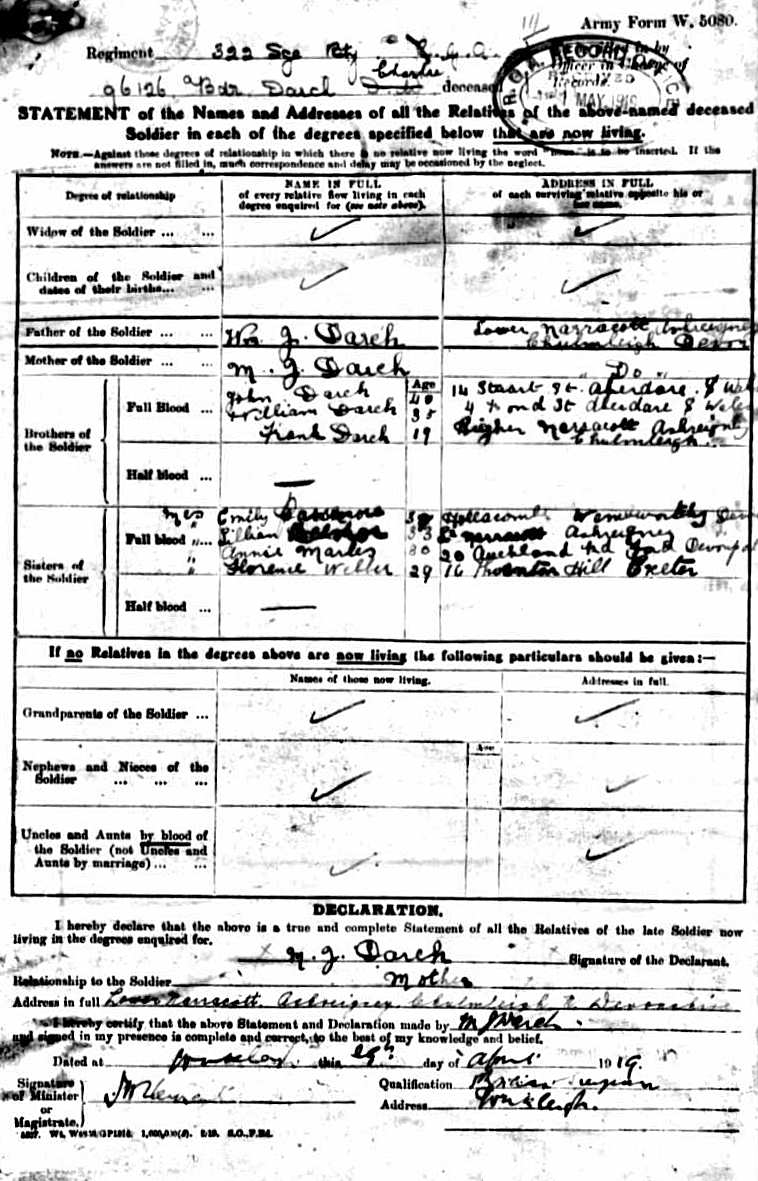 In order to obtain the medals and other effects due to his next-of-kin after the war, on 29th April 1919 Mary Jane completed the appropriate form, witnessed by Dr. Clements (Names and addresses of Deceased’s Relatives). From this we learn that since 1911 the family had become somewhat scattered. William and Mary Jane were living at Lower Narracott, Winkleigh, having moved back there during the war. Both Charlie’s brother John had survived the war and returned to Aberdare, South Wales, to re-join his brother as a coal miner; their descendents living there still. The youngest brother, Frank, who had enlisted in the Devons but was spared war-service because of the Armistice, was working with his father at Narracott. Emily now aged 39 had married William Henry Passmore in 1905 was living at Hollocombe, Wembworthy. Lillian (now aged 33) had married Robert Keenor in 1912 and was also living at Lower Narracott. Hilda Annie, aged 30, who had married John Marles in 1911 was living at 20 Auckland Road, Devonport, and the youngest sister, Florence now aged 29 had married Charles Webber in 1915 and was living at 16 Thornton Hill, Exeter.