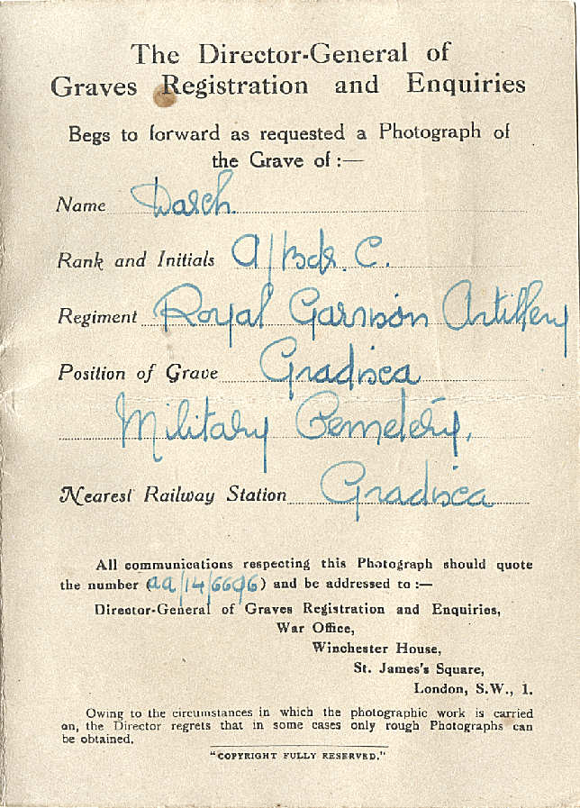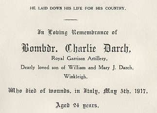 It is more than likely that Charlie’s parents made the request that was so earnestly desired after the war by so many, that his body should be returned to his family in Winkleigh, but no exceptions could be made to the rule. Instead the Director-General of Graves Registrations of the then Imperial War Graves Commission authorised photos to be taken of the cemetery at Gradisca and Charlie’s grave, and sent with an acknowledgement to the family. Preserved too is the memorial card sent by the loving parents to friends and relatives, containing the inscriptions and a poem: