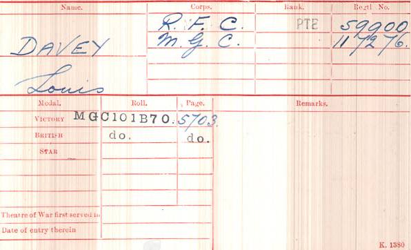 117276 Private Louis Davey is commemorated on the Cambrai memorial at Looverval, 16 kilometres west of Cambrai, where the names of 7042 casualties who fell in the battle of Cambrai, and who have no known grave, are recorded.