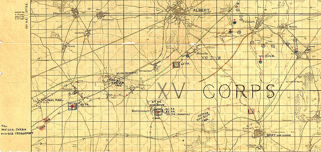 During the opening phases of the Somme (July 1st and 14th) the evacuation routes became totally swamped by the unprecedented numbers of casualties, with wounded men being sent untreated direct to Corbie, Heilly or Vecquement because Advanced and Divisional Dressing Stations simply could not cope with the demands. Even by 8th July orders were confirmed to send all cases to Vecquement (34 and 45 CCS) and only the very serious to Heilly, with Corbie temporarily closed, but by 10th July the position had somewhat eased. The attacks of 14th July were preceded by expansion and re-organisation. Extra Advanced Dressing Stations were established at Fricourt and south of Mametz Wood A second collecting point was established at Becordel, 36 miles from Corbie, which had re-opened for all but very serious cases that were supposed to go to Heilly. However, by the morning of July 15th Corbie was again swamped and closed, so that even the lightly wounded found themselves at Heilly.