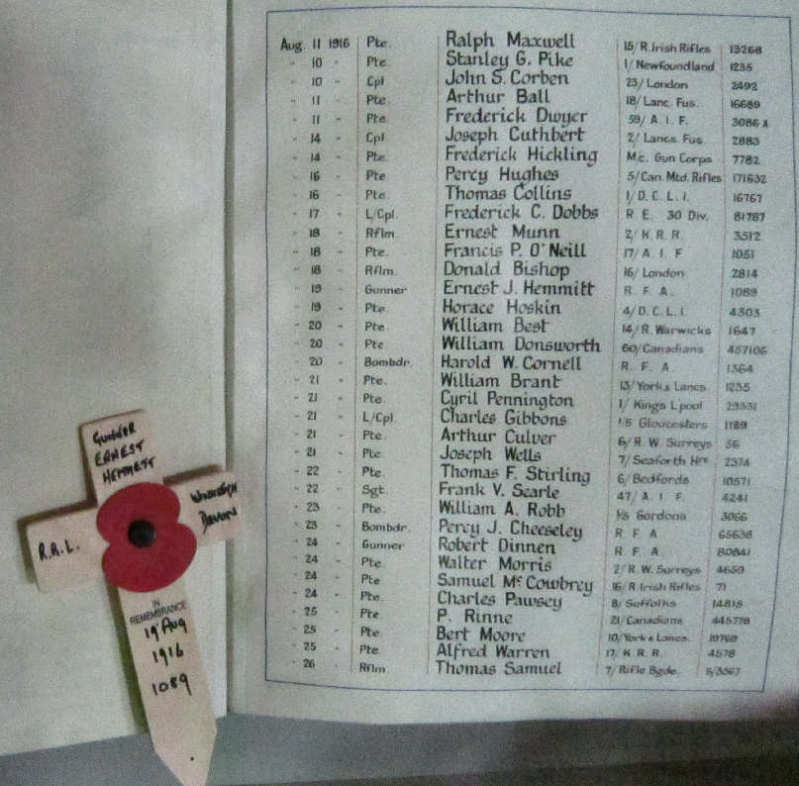The King George’s hospital records have not survived, but instead we have a unique record of Ernest Hammett’s arrival and death. At the end of the war the nurses and staff all contributed to a bound Roll of Honour recording the names of all those men who died of their wounds. The Roll is treasured and is displayed within the adjacent Parish Church of St. John the Evangelist, one of the four so-called Waterloo Churches built in 1824 to celebrate victory in the Napoleonic Wars. Set just outside the church is a Crucifix with the inscription: