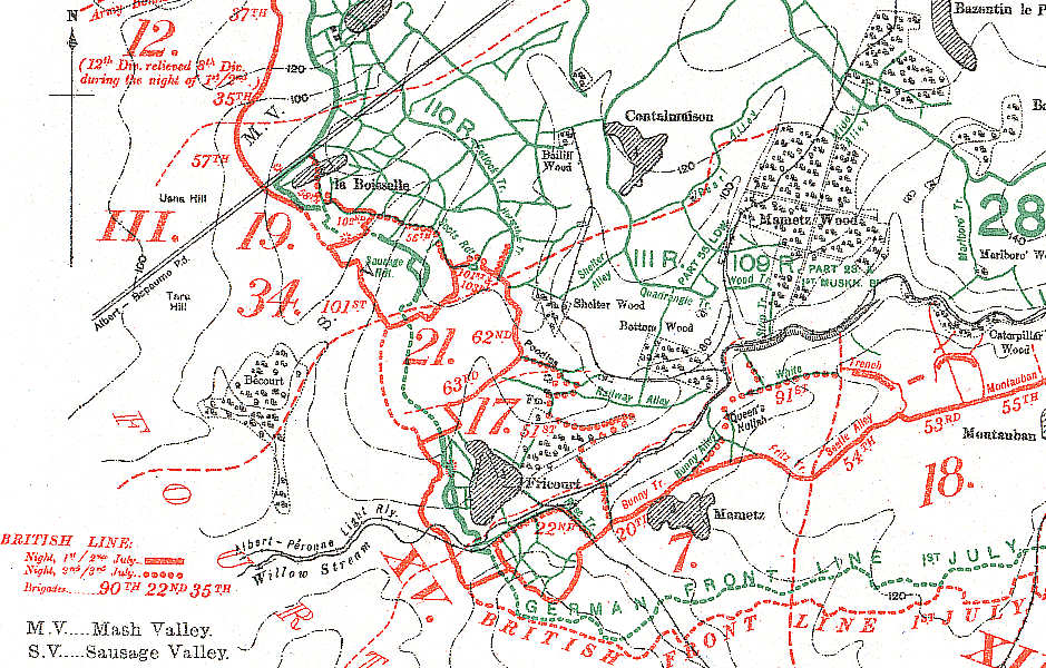 The final bombardment opened at 0625 hrs on July 1st, with the infantry going over the top at 0730. During the first day the 12th Battery fired 850 rounds, which included both gas and high explosive shells. By the end of the first day the 7th Division had captured Mametz and had put out a flank to cover Fricourt, at the cost of 3,410 casualties. The advance just west of Fricourt involved three Divisions: on the left the 7th with the 18th on their right and on the right of the 18th the 30th at which point the British line joined that of the French. Click HERE to display the Mametz map for the 2nd July. Montauban was captured by the 30th Division by 1.30 pm with severe loss, and along the front line of the three Divisions the field artillery was pushed up to the old British front-line. The 35th Brigade had advanced past Mansell Copse, but further progress was held up because bridges were needed for horses and guns to cross the German trenches. The map shows the targets of the 35th Brigade in the first 10 days of the battle.