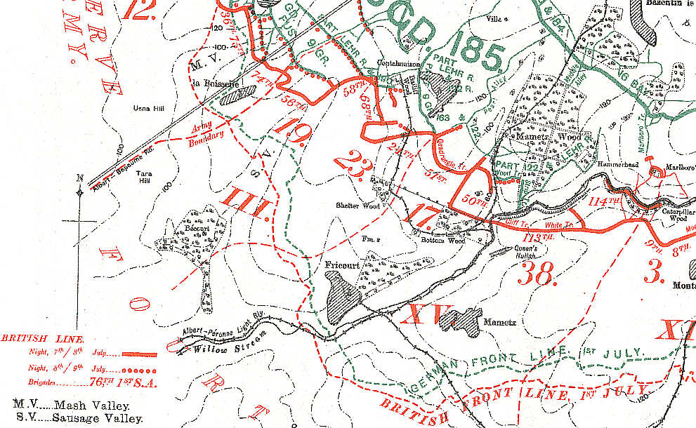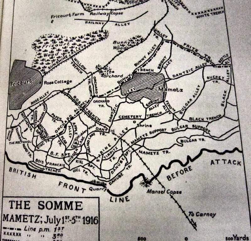 There was now a pause in the battle and no further advance was made. This was Rawlinson’s next costly mistake. Mametz Wood (behind which Hammett was killed), Trones Wood and the open ground beyond could have been taken easily on 1st July. By 19th July the Germans had reoccupied the area: the cost now for taking it was enormous. In the respite that was allowed them the Germans had re-occupied and re-wired their positions, while fallen trees and undergrowth further impeded any attack. German artillery barrages were frequent on the southern area beyond the wood and on the British batteries.