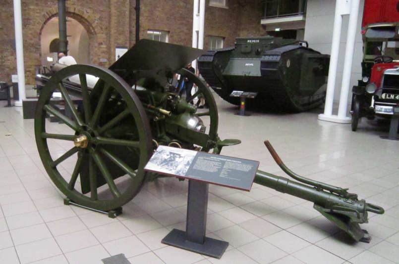 An Artillery Brigade, the equivalent to an infantry Battalion, was the basic tactical unit of the field artillery, and was composed of a Brigade Headquarters commanding 3 Batteries and an Ammunition Column. At full establishment, a brigade of 18 pounder field guns consisted of 795 men of whom 23 were officers. The Brigade was usually commanded by a Lieutenant-Colonel and the H.Q. included 4 other officers - a Captain or Lieutenant in the role of Adjutant (in charge of administration), a Captain or Lieutenant as the Orderly Officer (responsible for stores and transport), an officer of the Royal Army Medical Corps and an officer of the Veterinary Corps. Usually lettered A to D, each of the Batteries numbered 198 heads at full establishment. Each was commanded by a Major or Captain, with a Captain as Second-in-Command, and 3 Lieutenants or Second-Lieutenants in charge of the 2-gun sections. Battery establishment also included a Battery Sergeant-Major, a Battery Quartermaster Sergeant, a Farrier-Sergeant, 4 Shoeing Smiths (of which 1 would be a Corporal), 2 Saddlers, 2 Wheelers, 2 Trumpeters, 7 Sergeants, 7 Corporals, 11 Bombardiers, 75 Gunners, 70 Drivers and 10 extra Gunners acting as Batmen. Very often of course casualties meant that the establishment of officers, men, guns and horses were below this level. At the outbreak of war, field gun batteries of the Regular Army had 6 guns, while those of the Territorial Army had only 4 guns. The standard weapons, which did not alter during the war other than by technical improvements, were the 18 pounder horsedrawn field gun (see image on the right), and the 4.5-inch tractor-pulled howitzer. Though not so quick firing as the French ‘77’s, the best field gun of the war, the British guns were formidable weapons. Weighing 1.26 tons, the 18 pounder could throw a 3.3” shrapnel or high explosive shell 6,525 yards at maximum range.