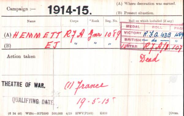 Ernest Hammett enlisted in the R.H.A., his medal card showing that he joined up in Bristol (or perhaps the Bristol area), possibly posted to his nearest R.H.A. Territorial Battery stationed at Taunton, a unit allocated as artillery support to the 2nd South Western Mounted Brigade. With the number of recruits coming forward the Battery was duplicated before the end of 1914 into the 1st/1st Somerset Battery and the 2nd/1st Somerset Battery. It could not have been long, however, before he was transferred to the 12th Battery of the 35th Brigade of the Royal Field Artillery, the three Batteries of the Brigade (12th, 25th and 58th) that were to provide the firepower for the newly-formed 7th Infantry Division, an elite Division formed during late September and early October 1914 by bringing together regular army units from various points around the British Empire. The 35th R.H.A. Brigade joined the 7th Division in September 1914.