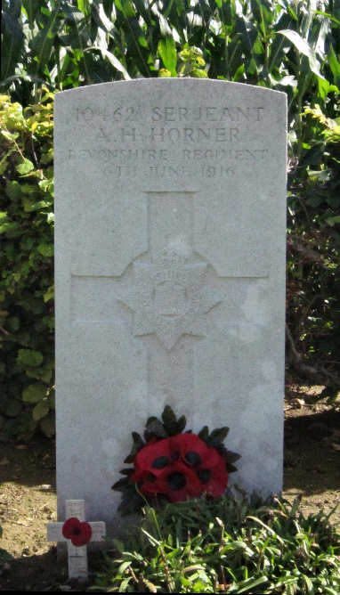 Battle orders of the 20th Infantry Brigade for July 1st indicate that for their part of the line the 8th Devons Aid Post was at Wellington Redoubt and the Advanced Dressing Station at The Citadel. The Divisional Collecting Post was near Orchard Camp on the Bray-Albert Road These was already in the process of being set-up in readiness, but it is much more likely that Arthur Horner was taken by a direct route to the nearby Casualty Clearing Station at Corbie along the road that follows the Somme river due West. Corbie is a village 15 kilometres south-west of Albert and approximately 23 kilometres due east of Amiens. La Neuville Communal Cemetery is north of the village. In April 1916, No.21 Casualty Clearing Station came to La Neuville and remained there throughout the 1916 Battles of the Somme, until March 1917. La Neuville British Cemetery was opened early in July 1916, but at first burials were also made in the communal cemetery. Most of these date from this period, but a few graves were added there during the fighting on the Somme in 1918. In all, the communal cemetery contains 186 Commonwealth burials, all identified casualties, and form one long row on the eastern side of the cemetery.