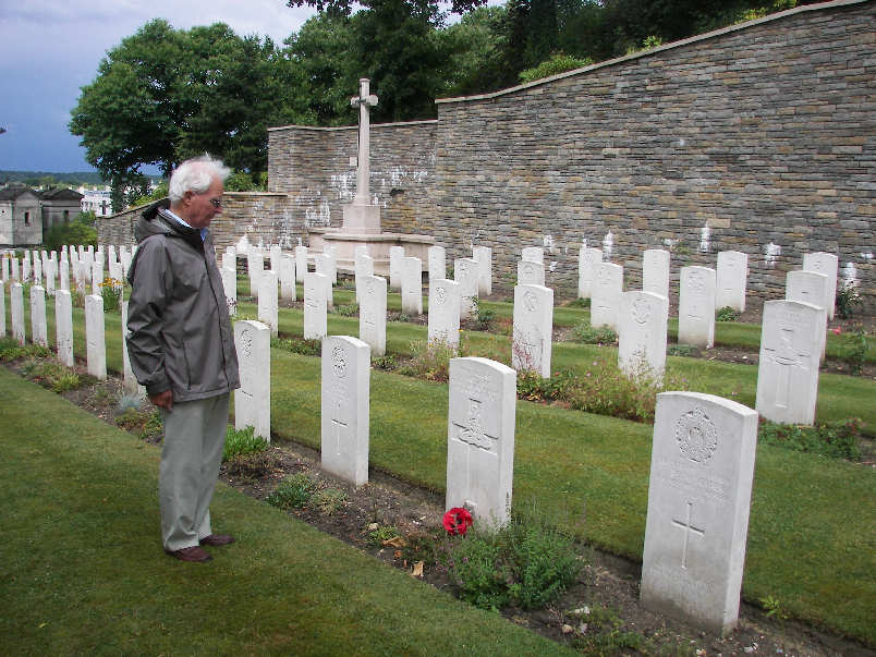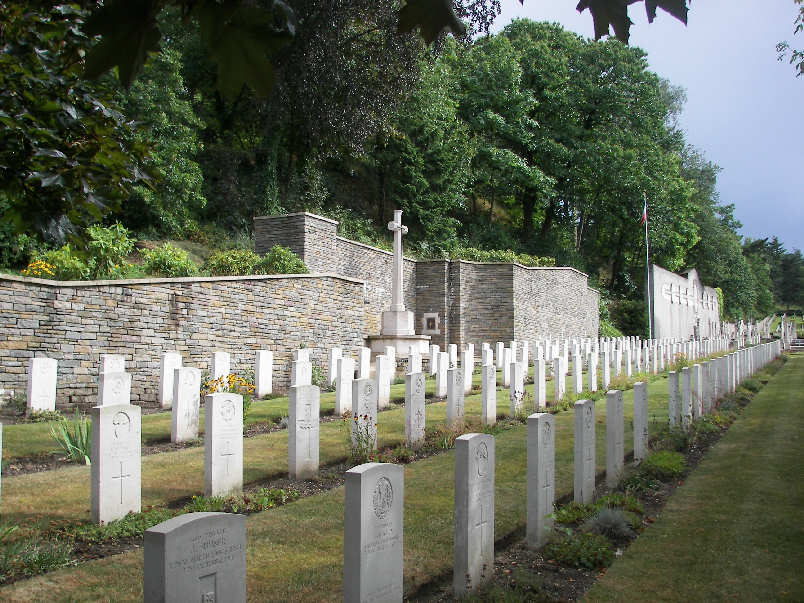 Somewhere within these numbers Sgt. Medlock was included, perhaps wounded, perhaps gassed, and with so many men to care for the pressure on the staff must have been enormous. Every man that could possibly stand the journey back to England was dispatched as soon as possible on outgoing trains, while the severely wounded or gassed together with those on the point of death had to be cared for as best as possible. The hospital records in their War Diary make no mention of the numbers or names of men who died, but for those who did not survive a burial ground was found just outside Versailles, in the suberb of Les Gonards, a mere 15 minutes walk from the city centre and the Palace. Here Sgt. John Medlock was buried. This vast typically French 19th Century cemetery, complete with its many huge monumental tombs for the wealthy and the smaller graves of lesser folk was extended at its perimeter to allow for the burials of those who died of their wounds, gas poisoning or sickness in the No.4 General Hospital. There are just over 150 graves, all identified. It is a beautiful place, five long rows of graves stretched bneath a high bank, the Great Cross overshadowing them. There was no room for a Stone of Sacrifice. As the ground beyond the British cemetery slopes upward to the right, there is a French cemetery of 1914-15 and beyond that a French Air Force cemetery, a North African cemetery and at the top German graves of 1944 resulting from the battle for Paris. The grave of Sgt. Medlock was visited in the summer of 2009, and a tribute was laid to the sacrifice he made and in remembrance of the events of that terrible year of 1915.