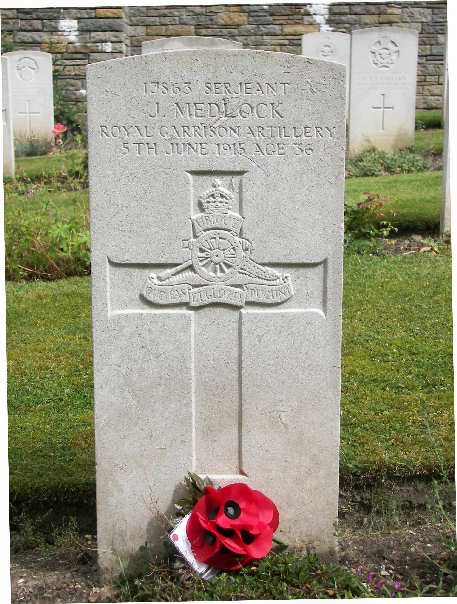 John and Isabel Medlock then returned to Malta where Britomarte Corcena, their third child, was born in 1911. The 1911 census shows that John Medlock was now a corporal (bombadier) in 99 Company, Royal Garrison Artillery stationed at Fort Ricasoli, Malta. In 1914, the family was again back in Ireland. The next we know is that the Chumleigh Deanery Magazine for July offered its deepest sympathy to Mrs. Medlock following the death of Sgt. Medlock on 5th June 1915. We read the useful information: ‘Sergeant Medlock, of the Royal Garrison Artillery, was stationed in Ireland when the war broke out. Only a few months ago he was sent to the front with the Trench Mortar Section’.