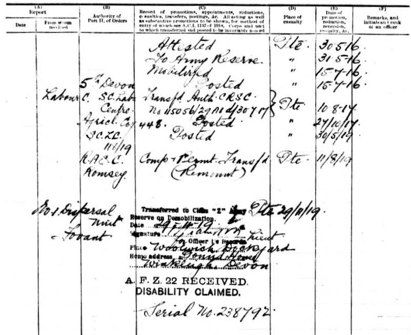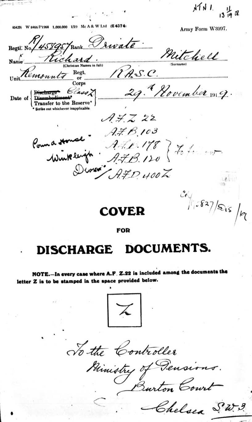 Of course, once in the army, he was as liable as anyone else to be transferred to another unit as the situation demanded. In Richard Mitchell’s case it seems that overseas service was now out of the question on medical grounds, with the result that following his apparent recovery after a year in various hospitals he was transferred on 10th August 1917 to the Army Service Corps Labour Centre. This was followed on 27th October 1917 by a transfer to the 448 Army Service Corps Agricultural Home Service Labour Company, in which he served until the end of the war. Richard was awaiting demobilisation when on 30th May 1919, and still in the Agricultural Labour Company that was presumably now being disbanded, he was posted back to the Service Corps Labour Centre. After a further three months he was posted again on 11th August 1919 to the agricultural Remounts depot at Romsey, again being issued with a new army number, R458957, the R standing for Remounts. Men were still being demobilized more than a year after the war had ended, and on 29th November 1919 Richard’s turn finally arrived. Demobilized in the normal way, by being transferred to the ‘Z’ Reservists (an army list technically available to be recalled in an emergency), he reported to the No.1 Dispersal Unit at Woolwich Dockyard. At this point Richard claimed a pension based on the disability he had suffered as a result of his service.